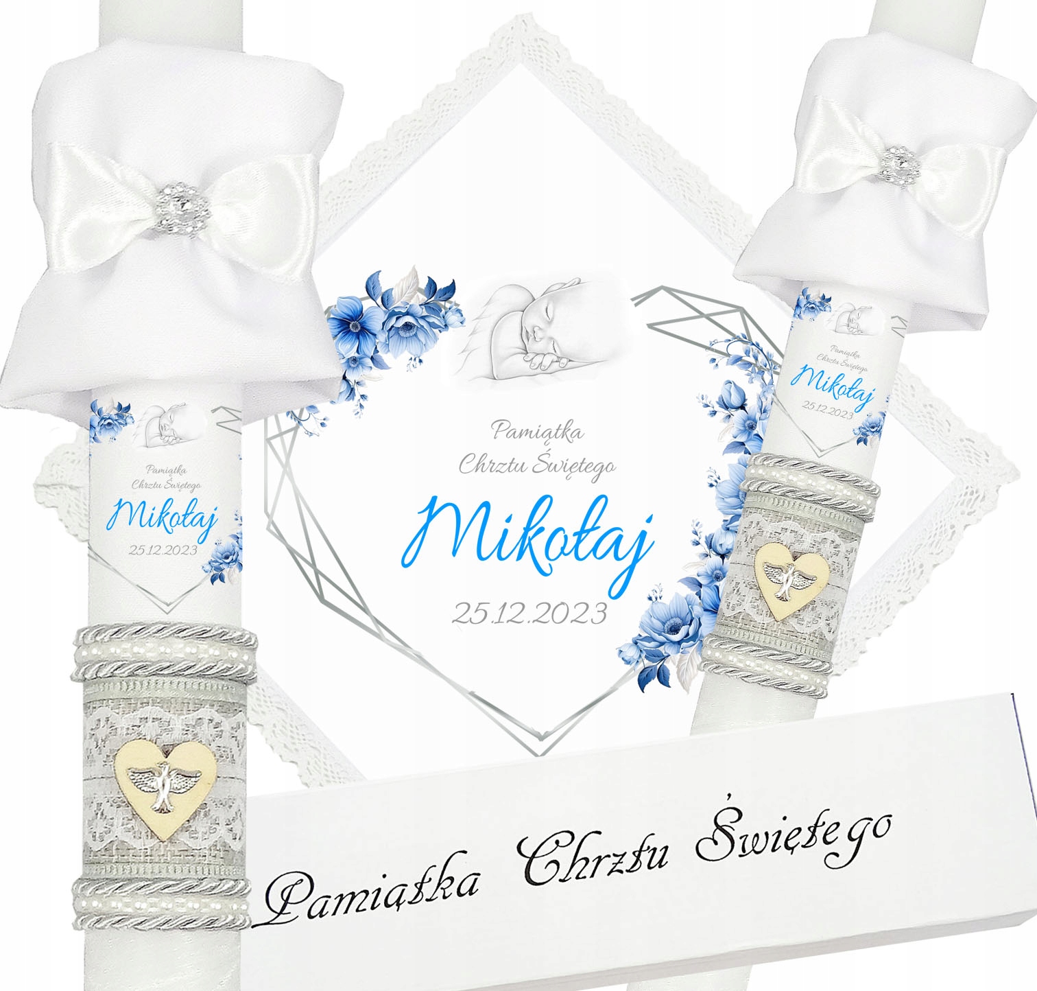 Представляем необыкновенный комплект из крестильной одежды и свечи, созданный с торжественным событие в жизни каждого ребенка. Халат выполнен из белоснежного материала и отделан хлопковым кружевом, что придает ему элегантность и нежность. Свеча декорирована вручную и имеет принт с именем ребенка, что делает ее неповторимым и неповторимым сувениром. Свеча имеет серебряную нить, на ее поверхности серая джутовая лента с кружевом и деревянное сердце с серебряной эмблемой Святого Духа на нем. Оставшуюся часть свечи обматываем белой шифоновой лентой. Все это упаковано в белую картонную коробку с надписью «Сувенир Святого Крещения», а также в комплект входит тканевый бонус-мешочек. Этот уникальный комплект из халата и свечи непременно подчеркнет церемонию крещения и усилит эмоции и воспоминания, связанные с этим особым событием.