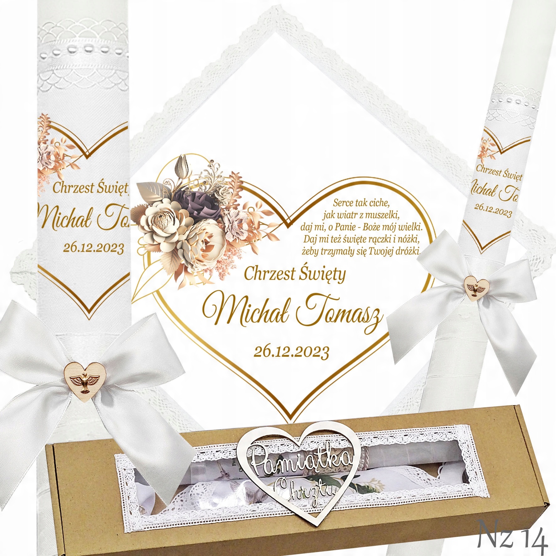Представляем необыкновенный крестильный набор, состоящий из халата и свечи, идеальный выбор для родителей. которые хотят отпраздновать этот особенный день элегантно и незабываемо. Свеча декорирована белой шифоновой лентой, что придает ей неповторимый характер и шарм. Верх свечи украшен атласным кружевом и белым жемчугом, что придает ей элегантность и шик. Лук с деревянным сердцем и металлической золотой эмблемой Святого Духа. добавляет очаровательный и сентиментальный оттенок. Все было упаковано в декоративную коробку, позволяющую хранить эти необыкновенные сувениры.