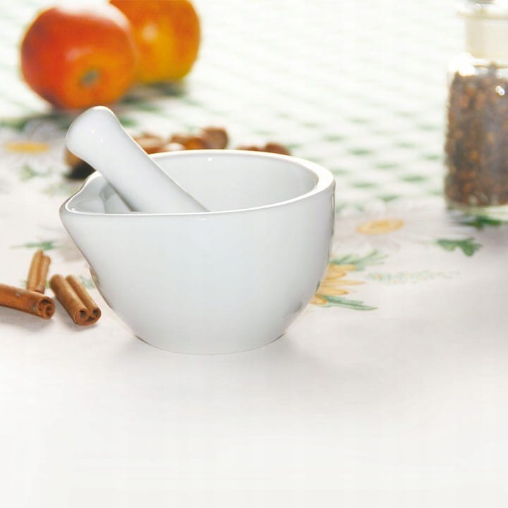 Эта небольшая белая керамическая ступка с пестиком длиной 8 см представляет собой изделие с высокой устойчивостью к повреждениям, полностью изготовленное из керамики.