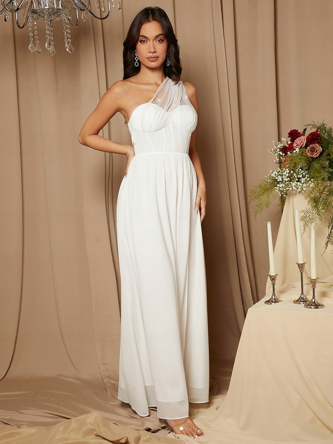 БЕЛОЕ ОДНОТОННОЕ СВАДЕБНОЕ ПЛАТЬЕ МАКСИ НА ОДНО ПЛЕЧО SHEIN 40/42
