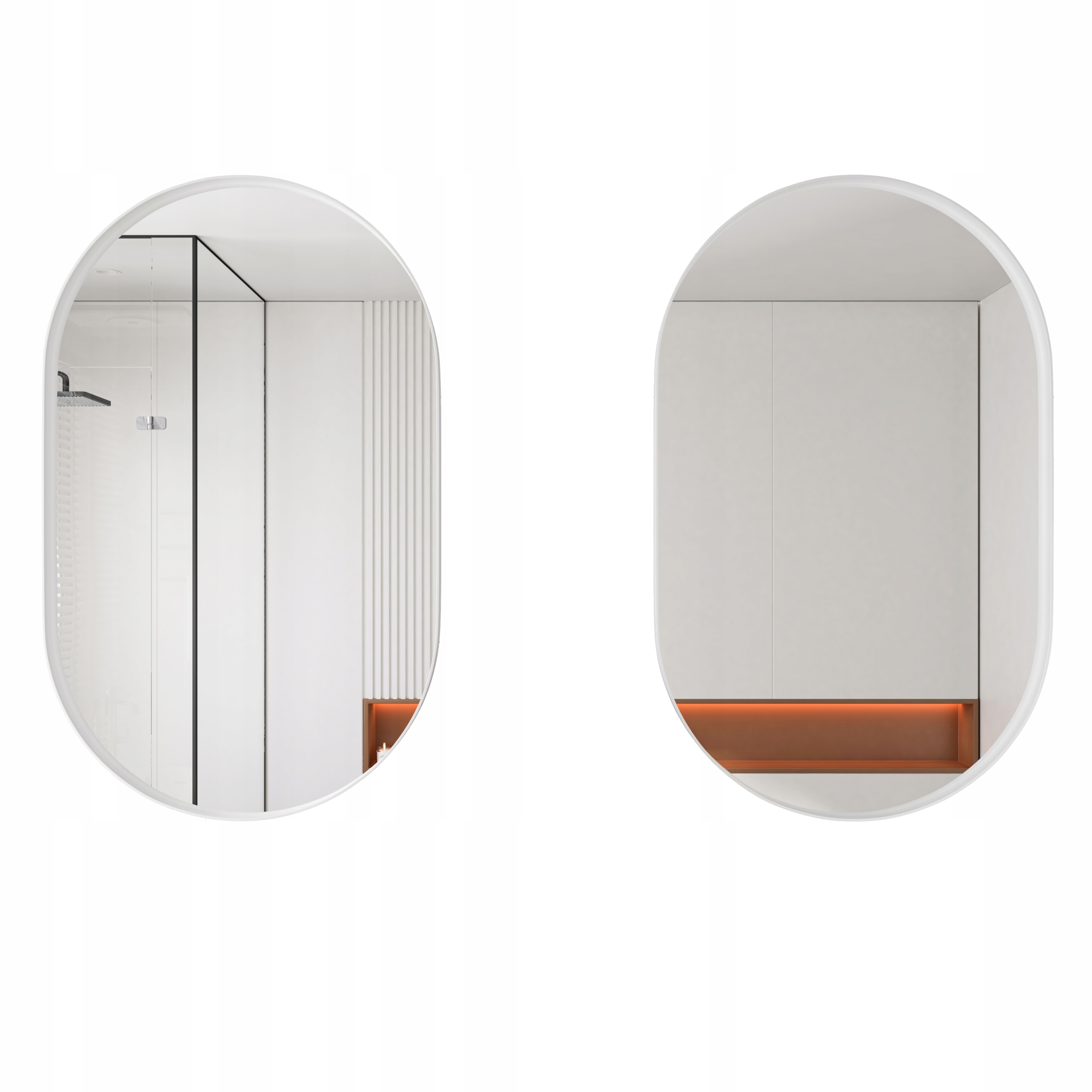 Белый овальный зеркальный шкаф, встраиваемый, с регулируемыми полками.