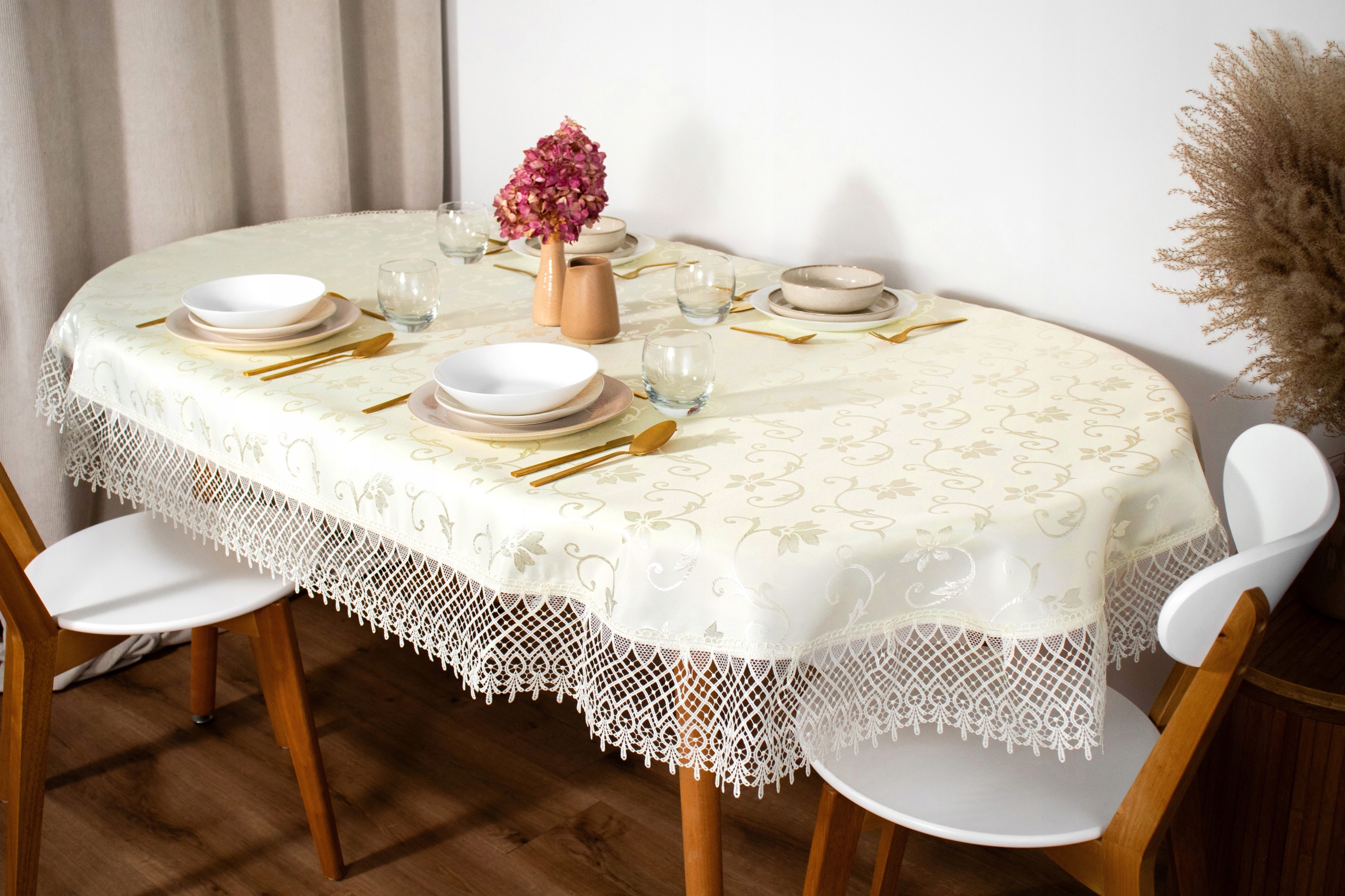 Скатерть классического цвета украшена нежным узором и восхитительной кружевной отделкой. Кружево придает ему тонкую легкость и делает его настоящим украшением стола. Прекрасно вписывается как в современный, так и в классический дизайн интерьера.