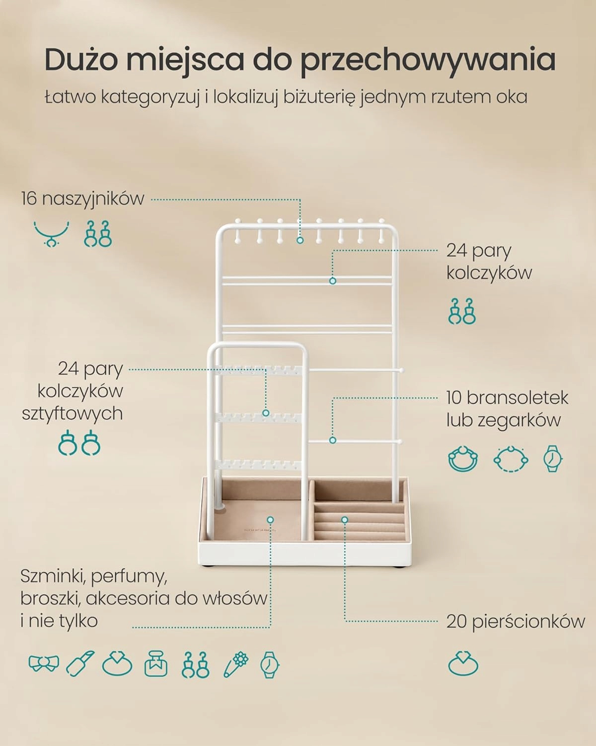✅ Универсальное хранение: Органайзер вмещает до 24 пар серег, 10 браслетов или часов, 16 ожерелий, а также мелкие предметы, такие как кольца, помады или броши.