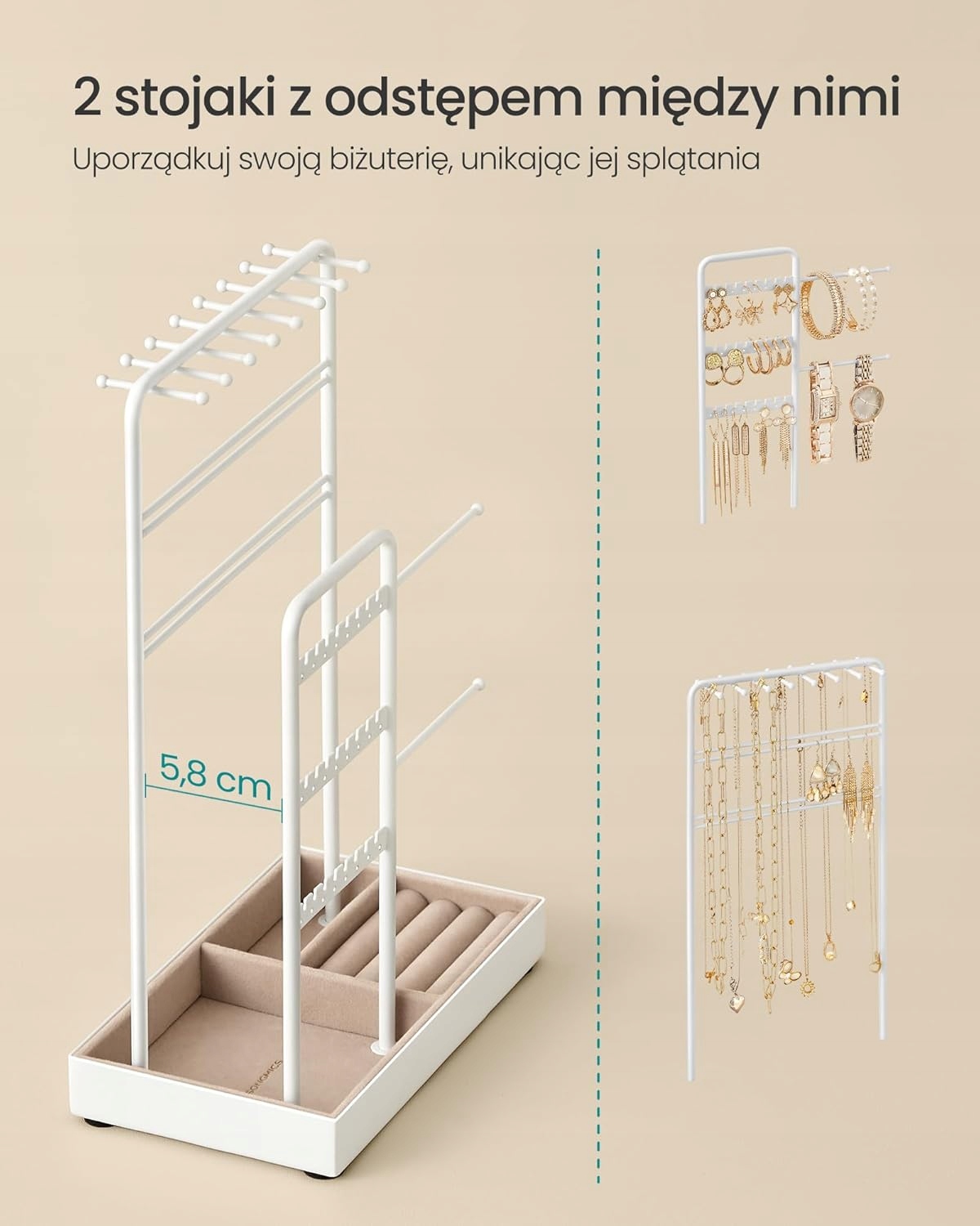 БЕЛАЯ ПОДСТАВКА ДЛЯ ЮВЕЛИРНЫХ УКРАШЕНИЙ С БАРХАТНЫМ ПОДНОСОМ, МЕТАЛЛИЧЕСКОЙ РАМКОЙ, РУЧКОЙ-ОРГАНИЗАТОРОМ
