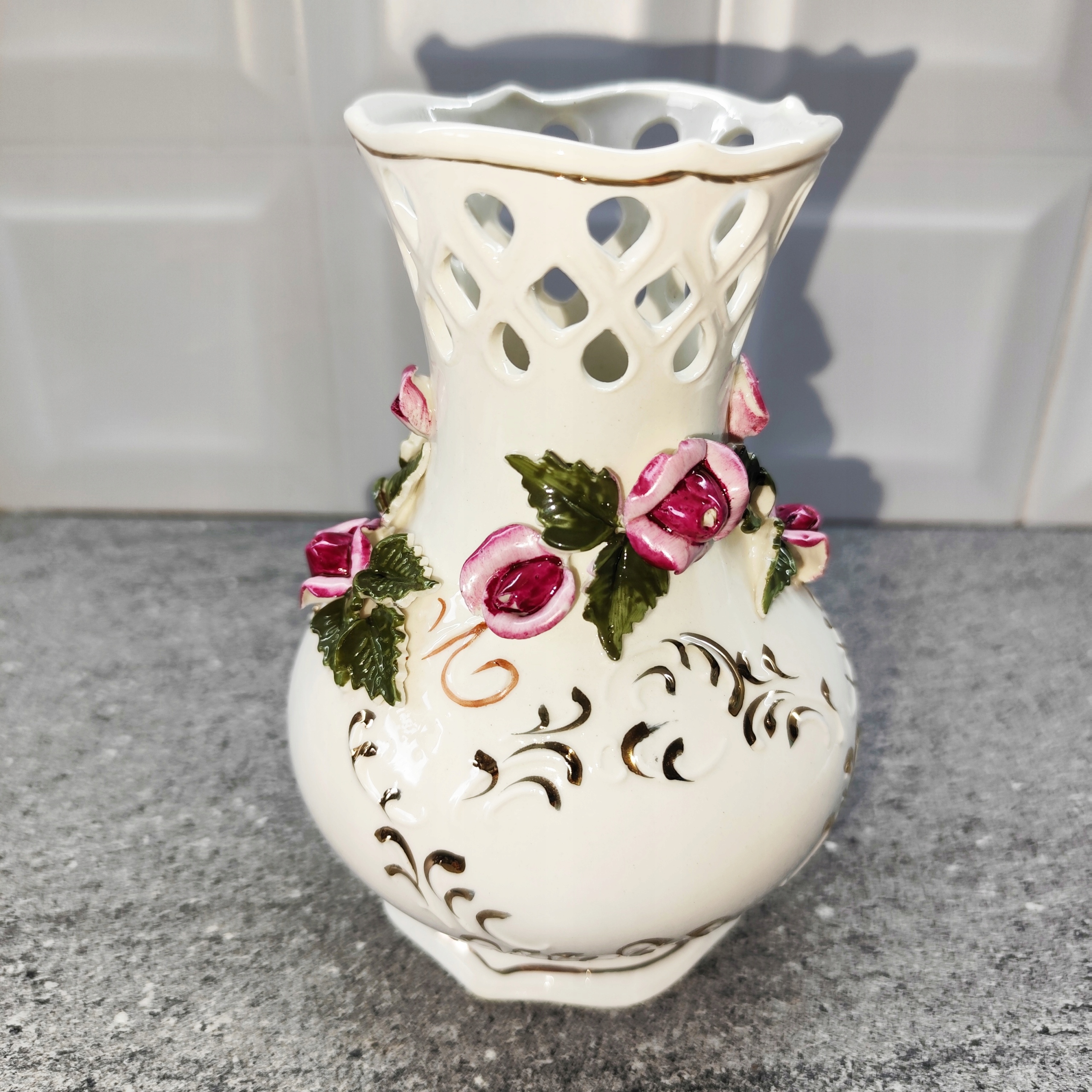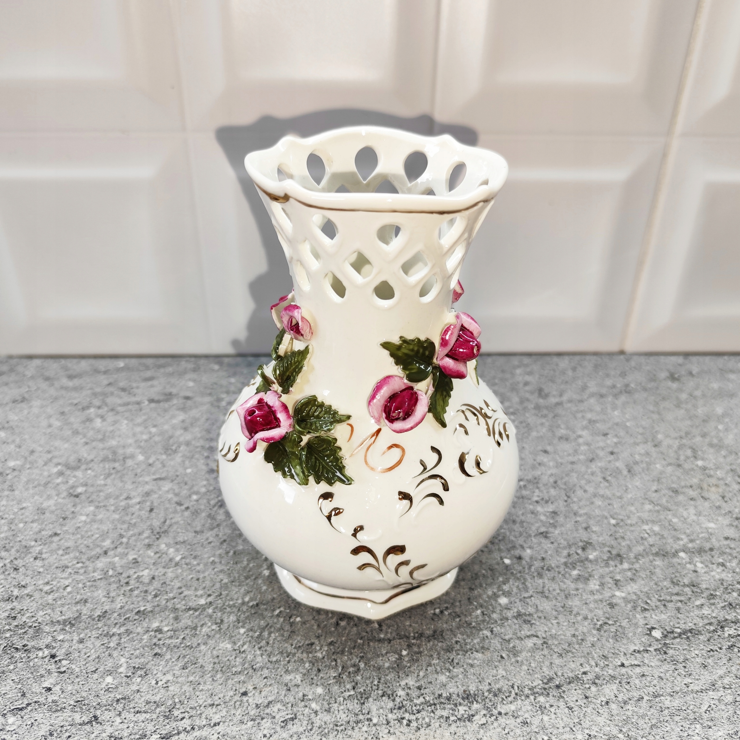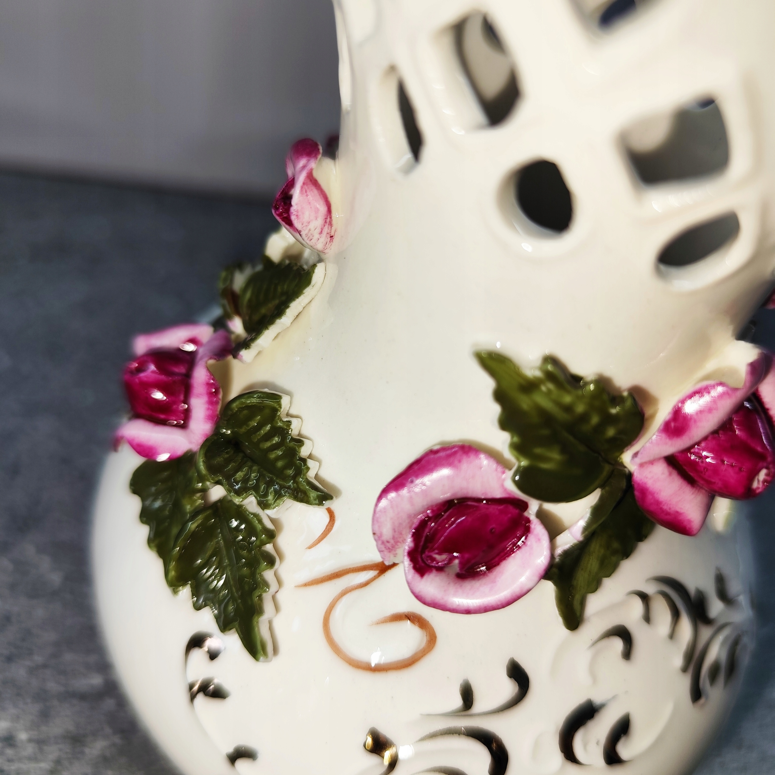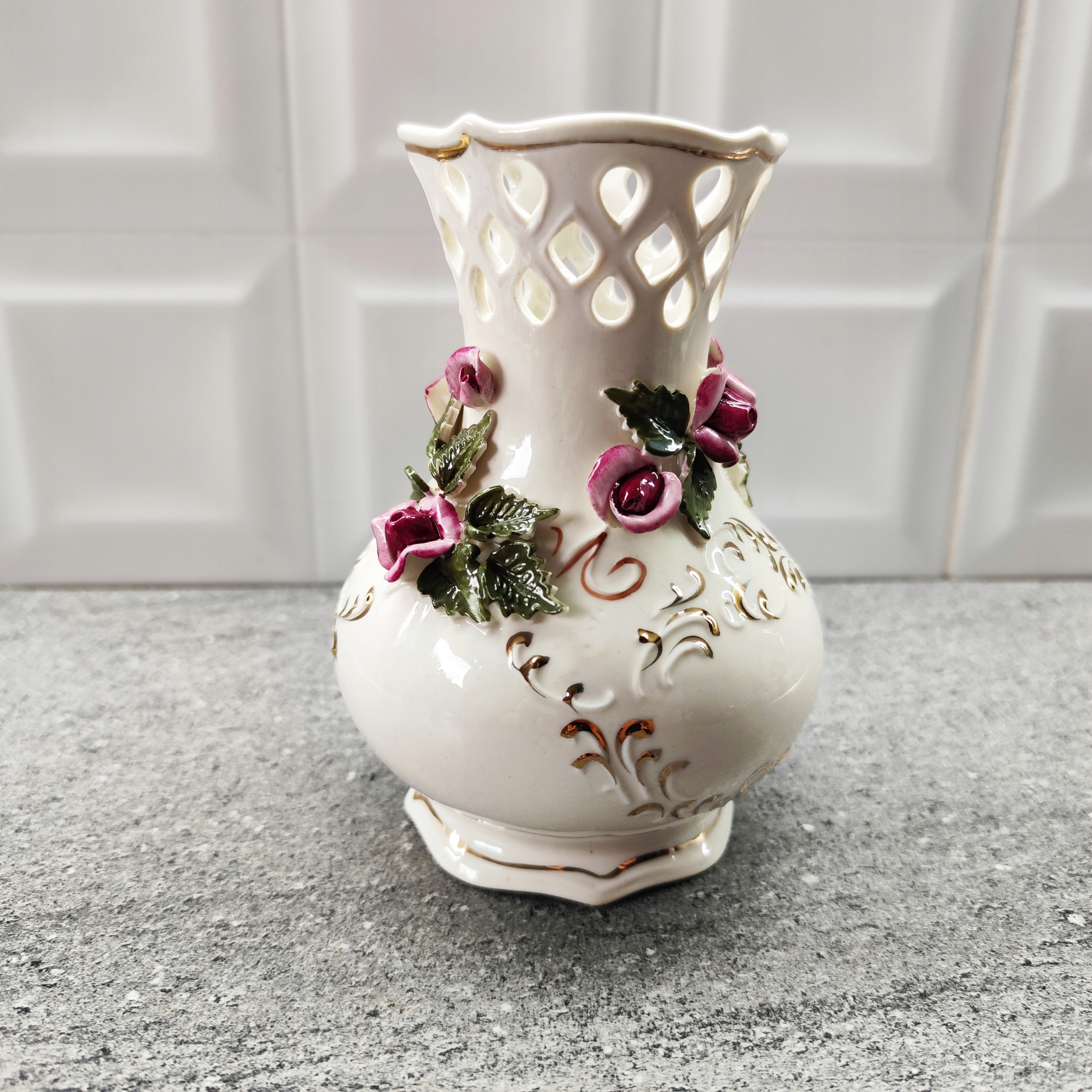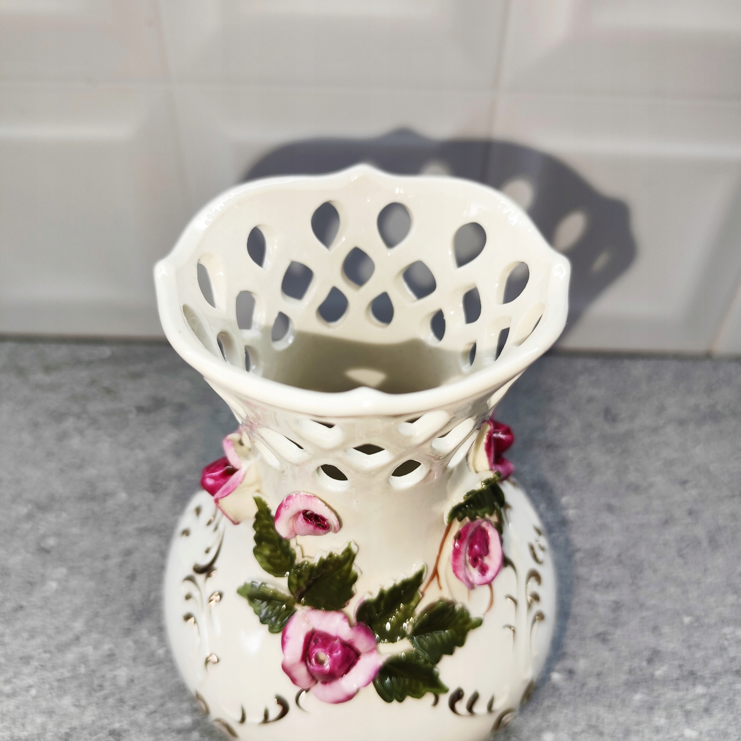 Белая фарфоровая ваза с расписанными розами, декорированная ажурная ваза