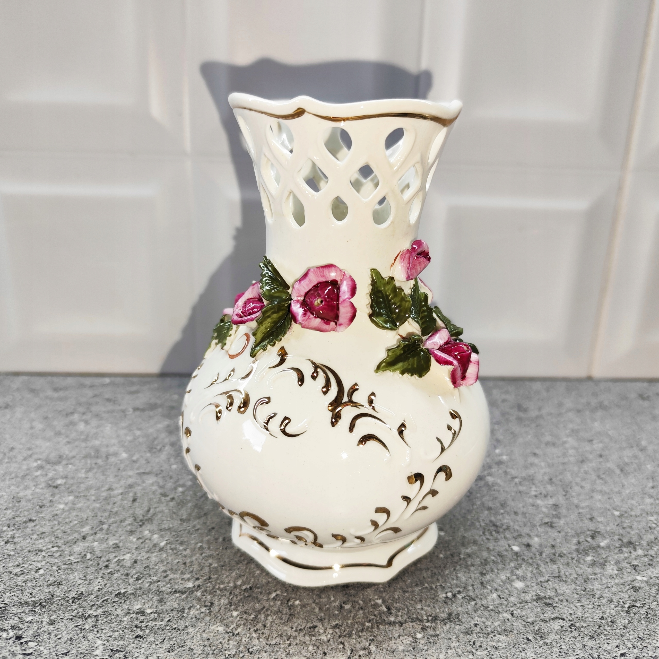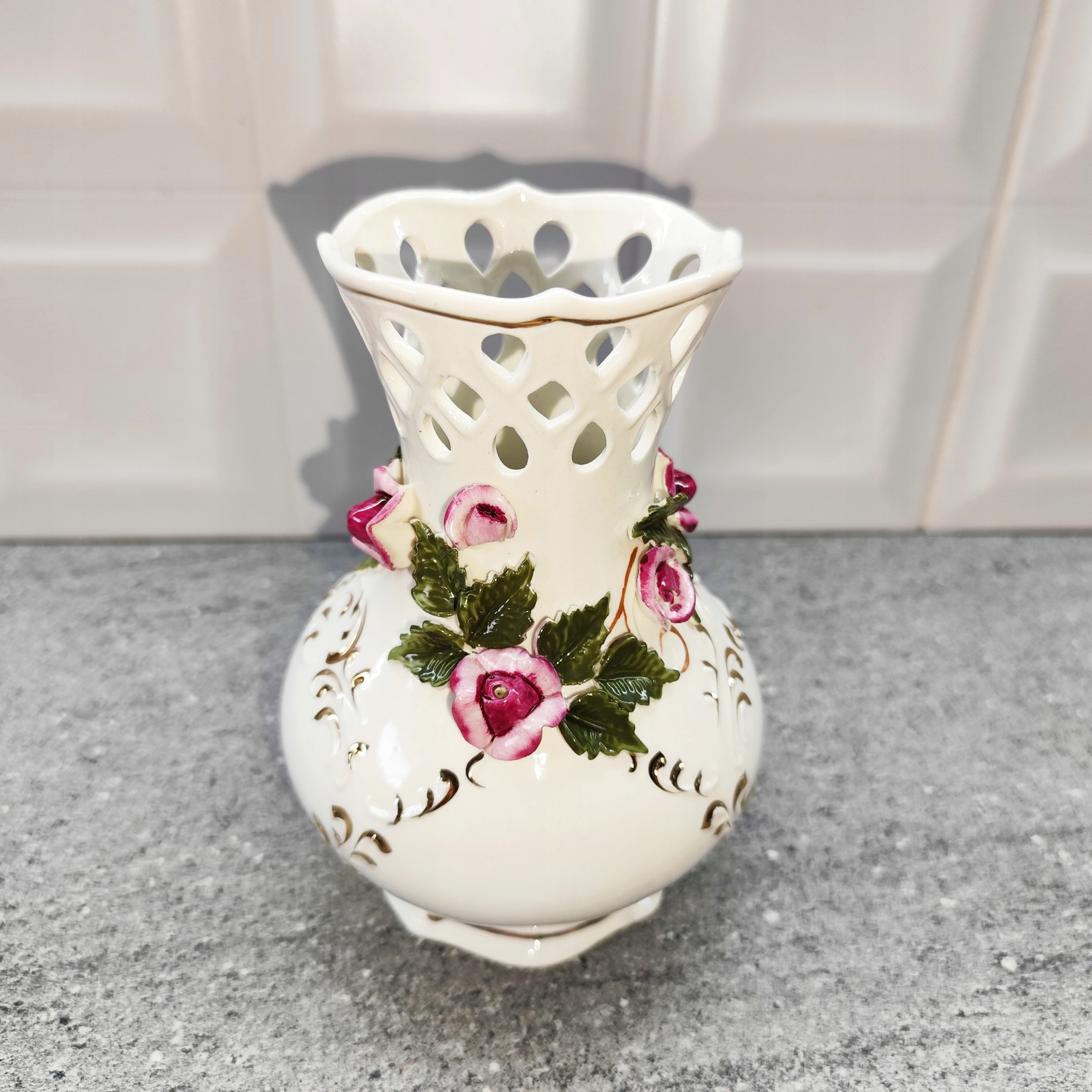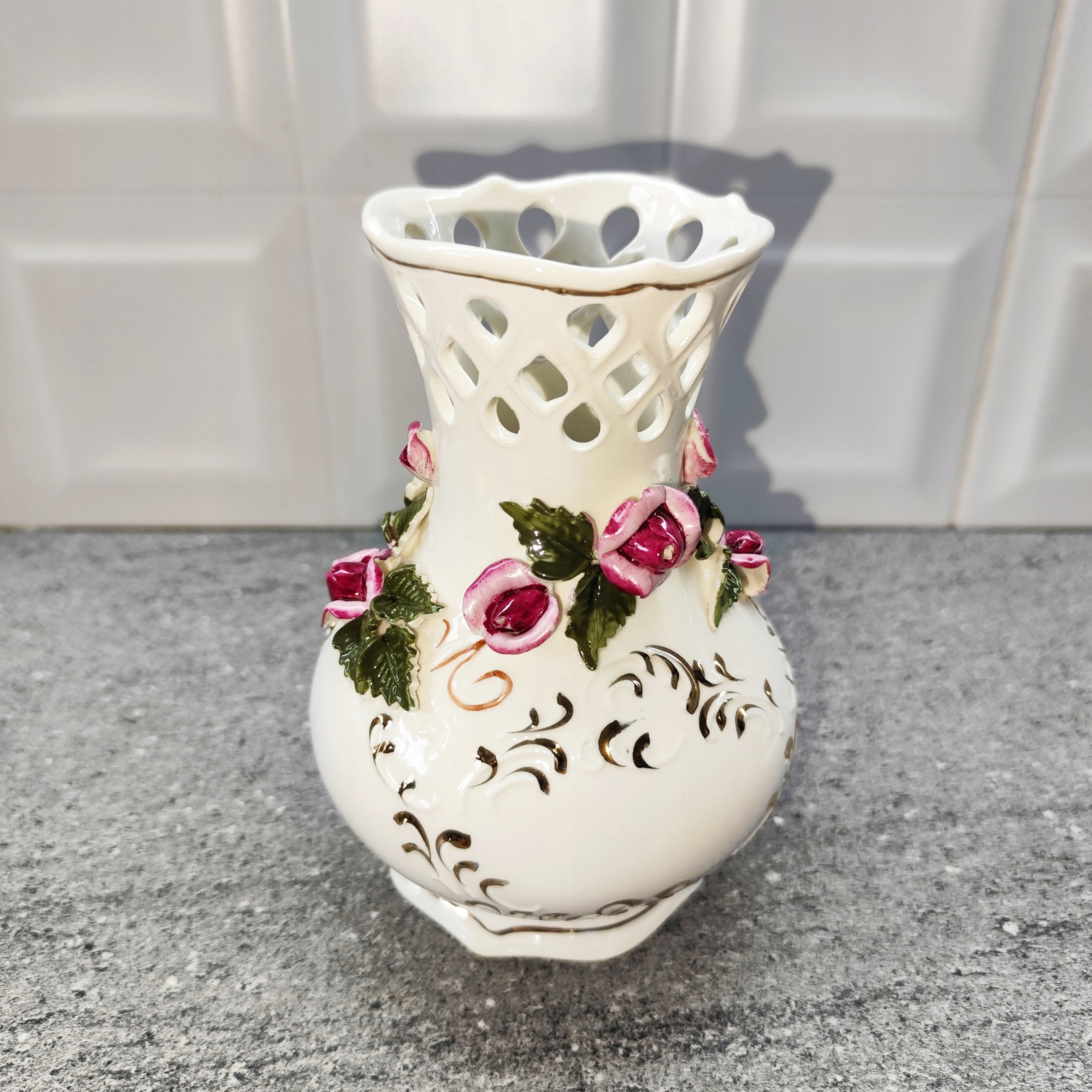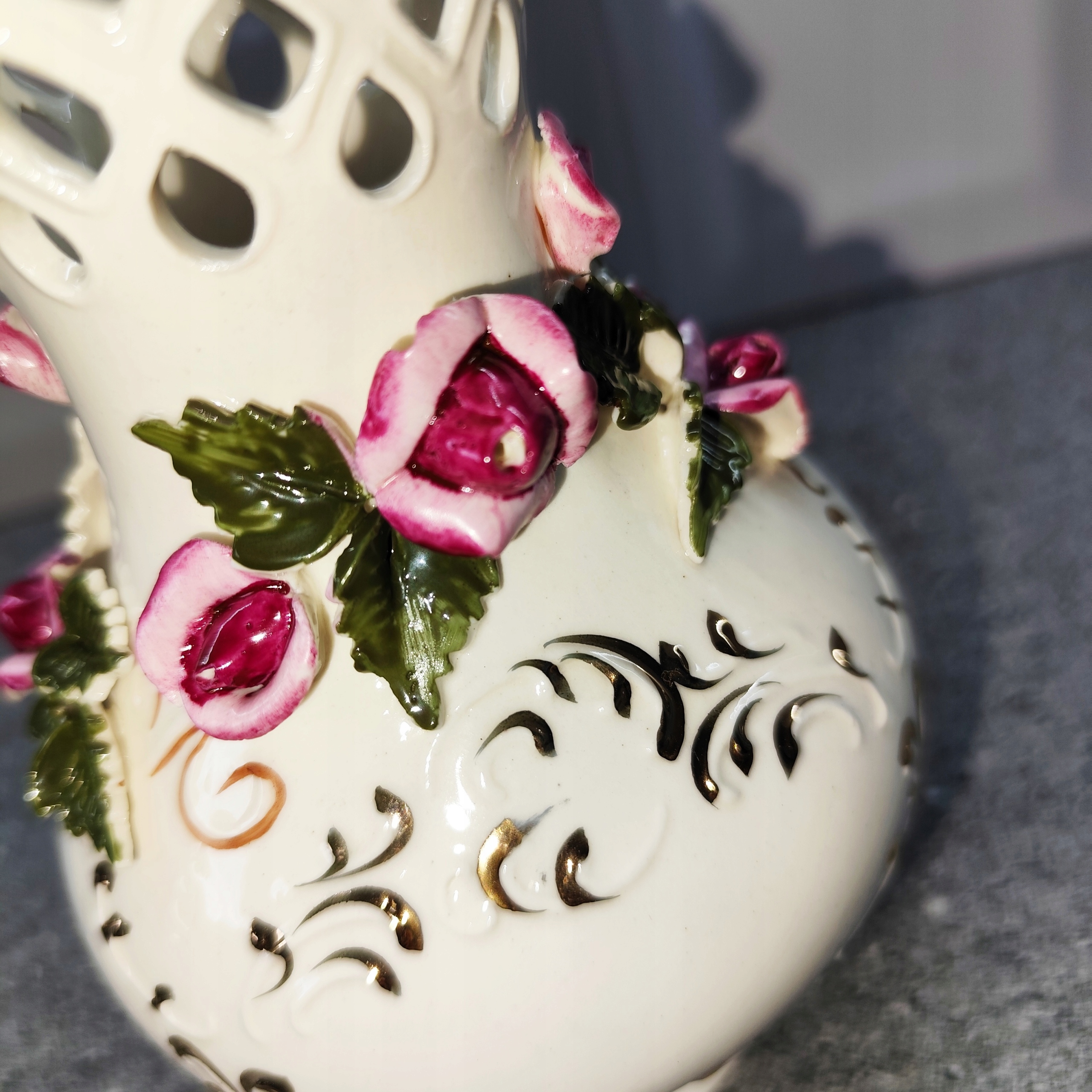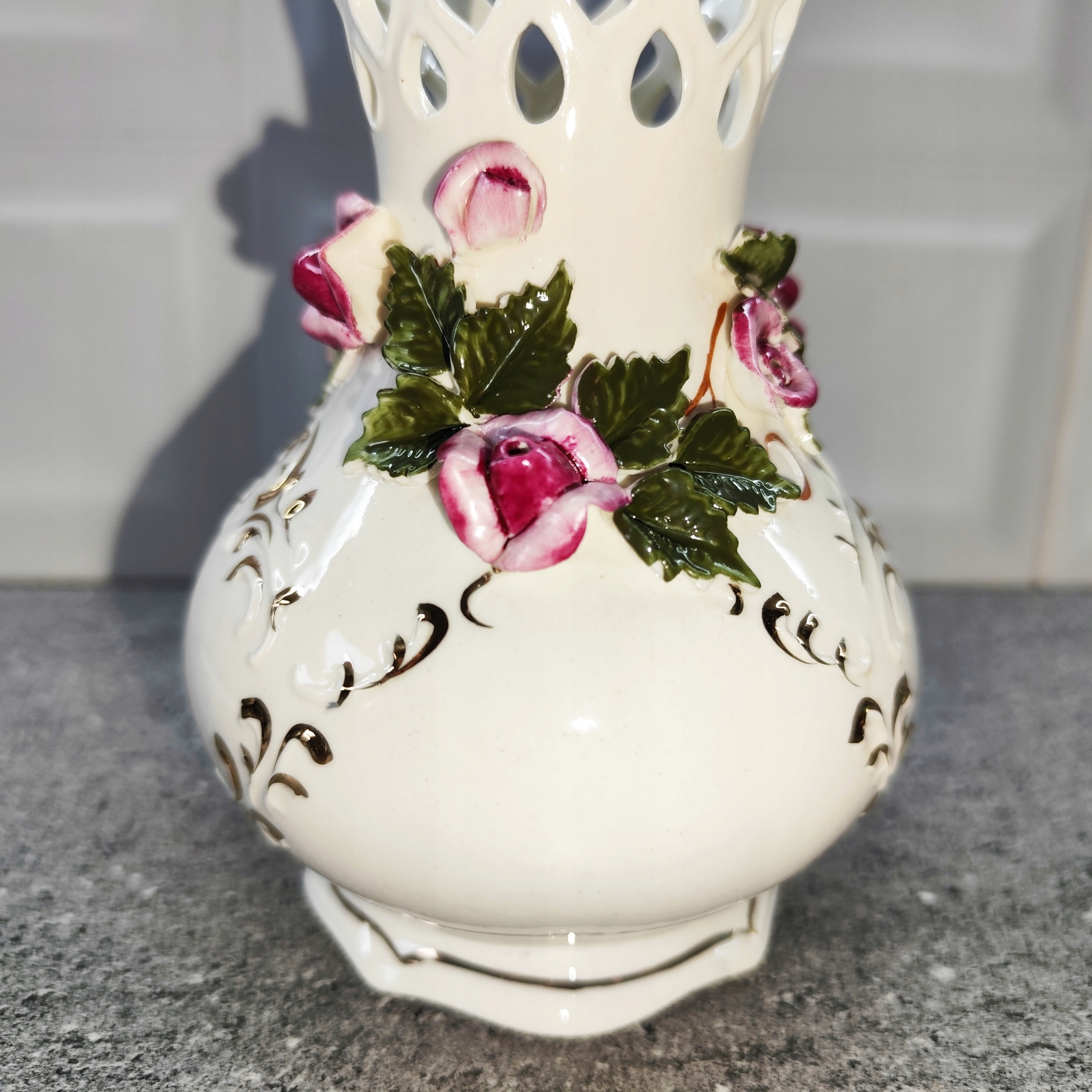 Белая фарфоровая ваза с расписанными розами, декорированная ажурная ваза