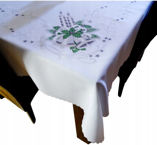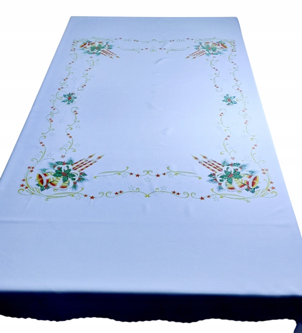 Элегантная БЕЛАЯ Рождественская грязеотталкивающая скатерть с очень красивым рисунком. Он покрыт слоем тефлона, который предотвращает впитывание жидкостей в структуру материала. Представленные скатерти изготовлены тщательно и аккуратно.