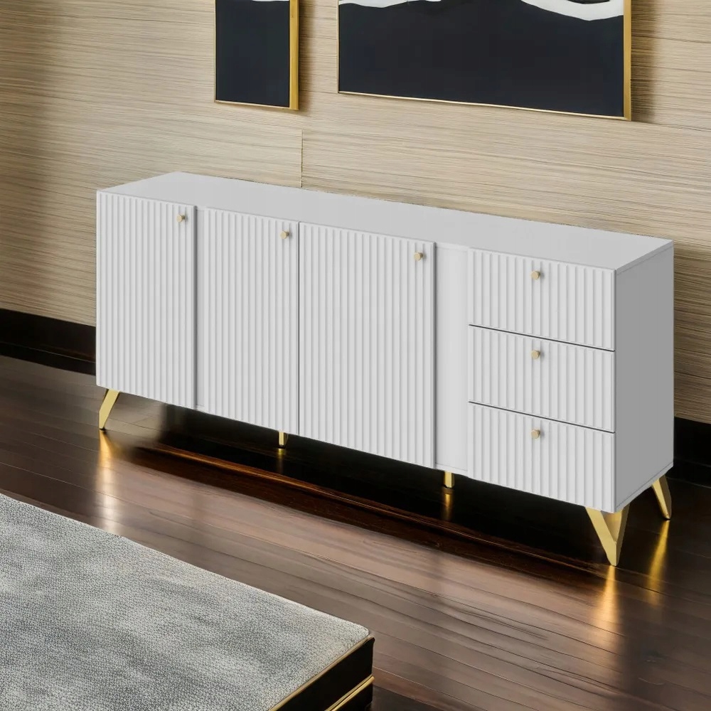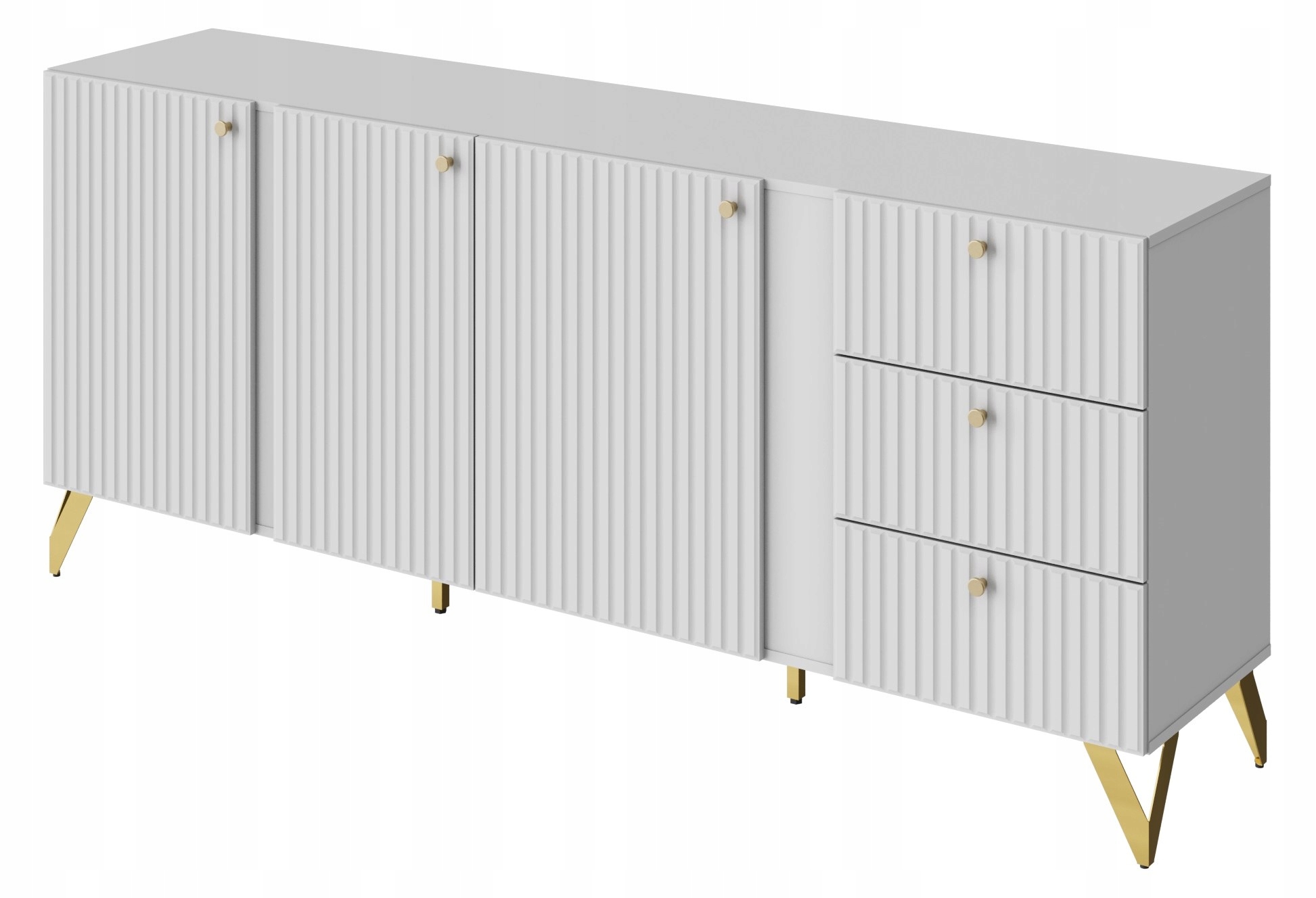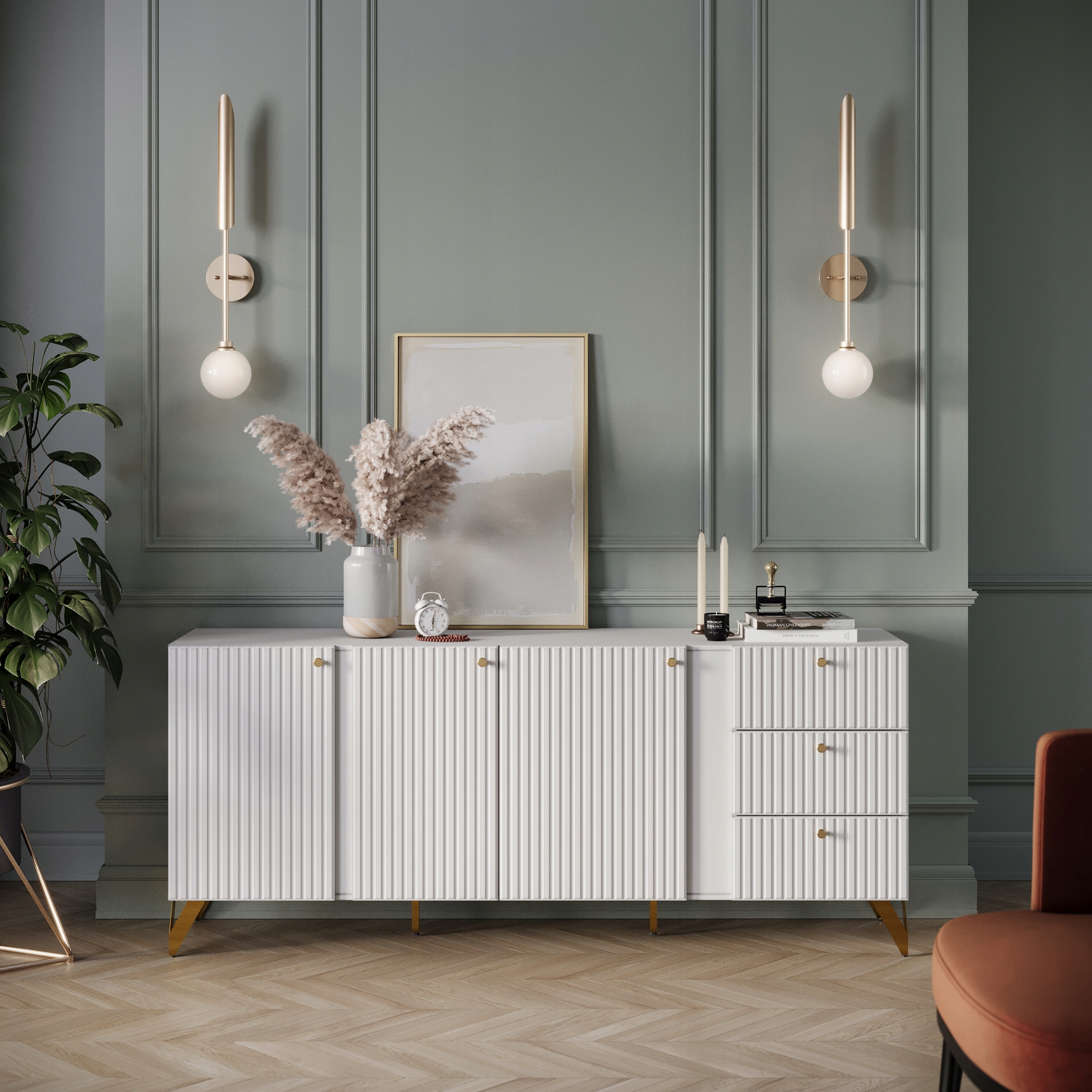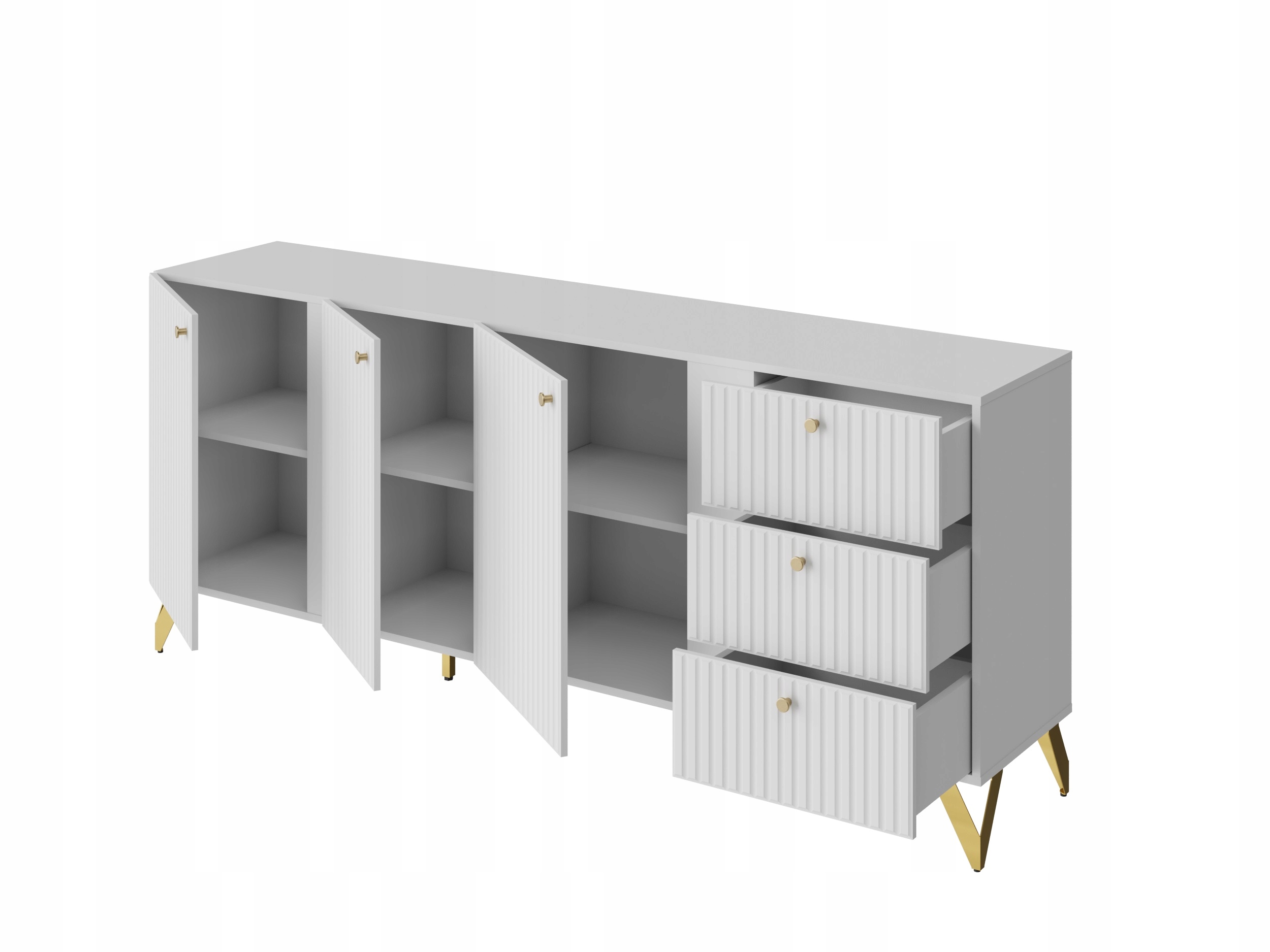 Универсальный белый цвет позволяет комоду вписаться в любой интерьер. Три вместительные секции за распашными дверцами и три выдвижных ящика обеспечивают максимальную вместимость. Петли с плавным закрыванием обеспечивают бесшумное закрывание. Скрытые монтажные направляющие с плавным закрыванием эстетичны и бесшумны. Регулируемые ножки позволяют идеально выровнять мебель. Фасады МДФ экологичны. Фрезеровка спереди добавляет красоты и современности. Высота ножек — 150 мм, что облегчает уборку под комодом.