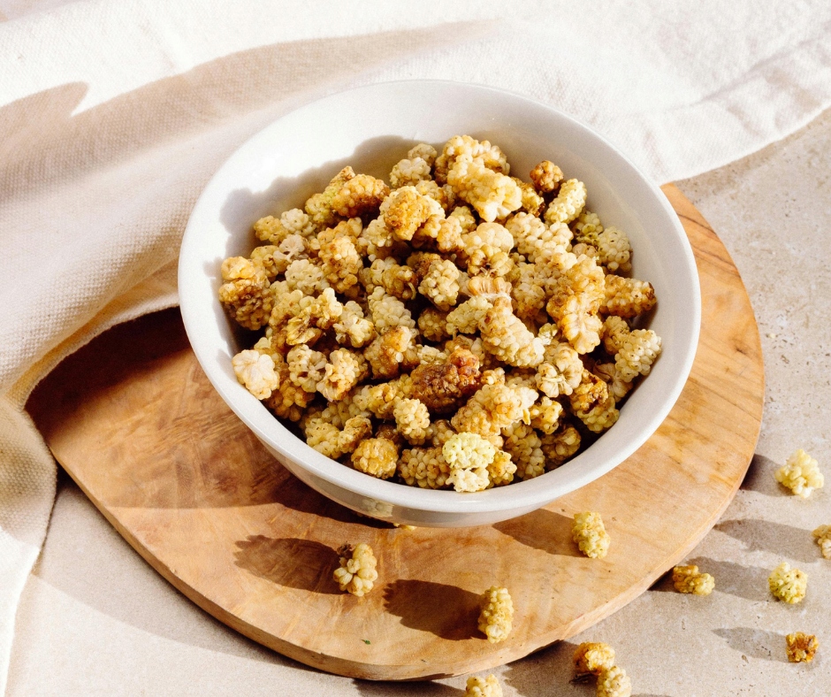 Просто смешайте сушеные фрукты, зерновые зерновые, овсяные хлопья и добавьте несколько горстков белой шелковицы, и мы получаем полную еду на завтрак. Вкус.