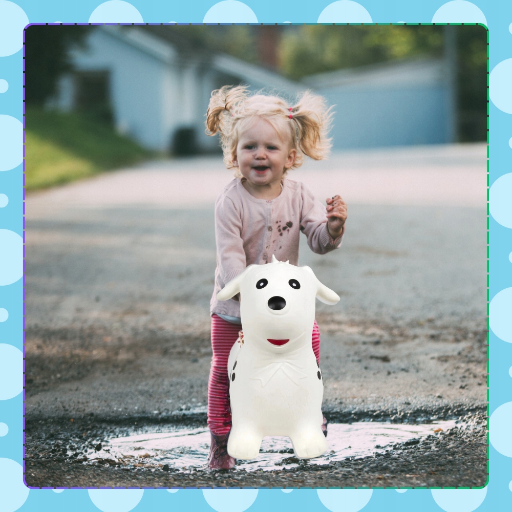 Белая собака накачала резиновая джампер для детей, чтобы прыгнуть за подарок