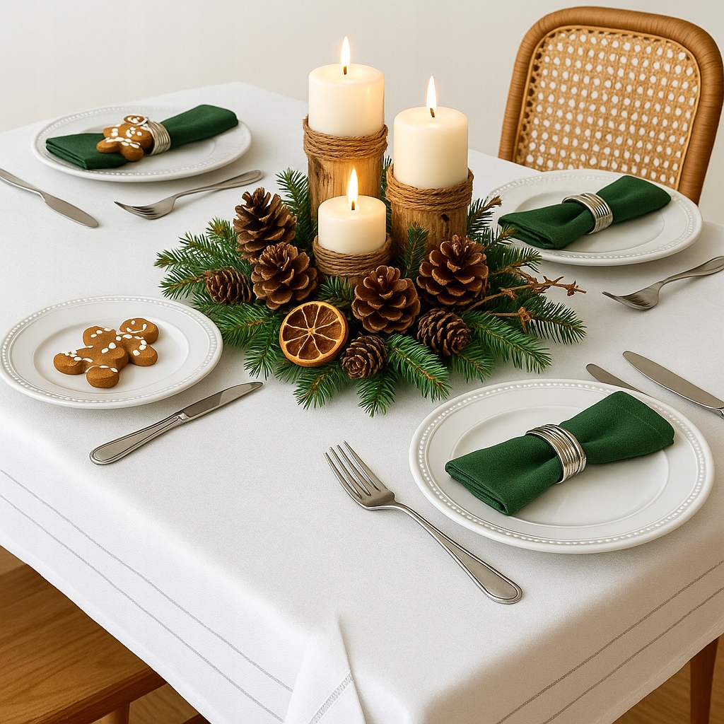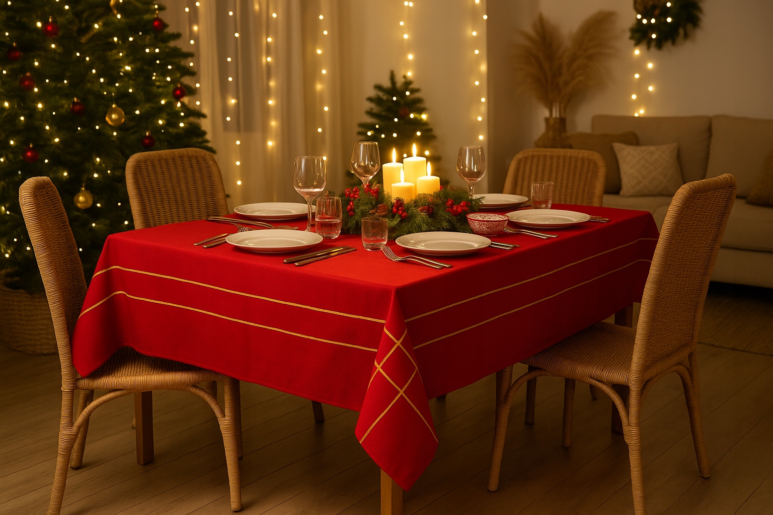 ⏺ Эта скатерть отлично смотрится с серебряной или зеленой посудой, зелеными салфетками и красными, серебряными или белыми свечами.