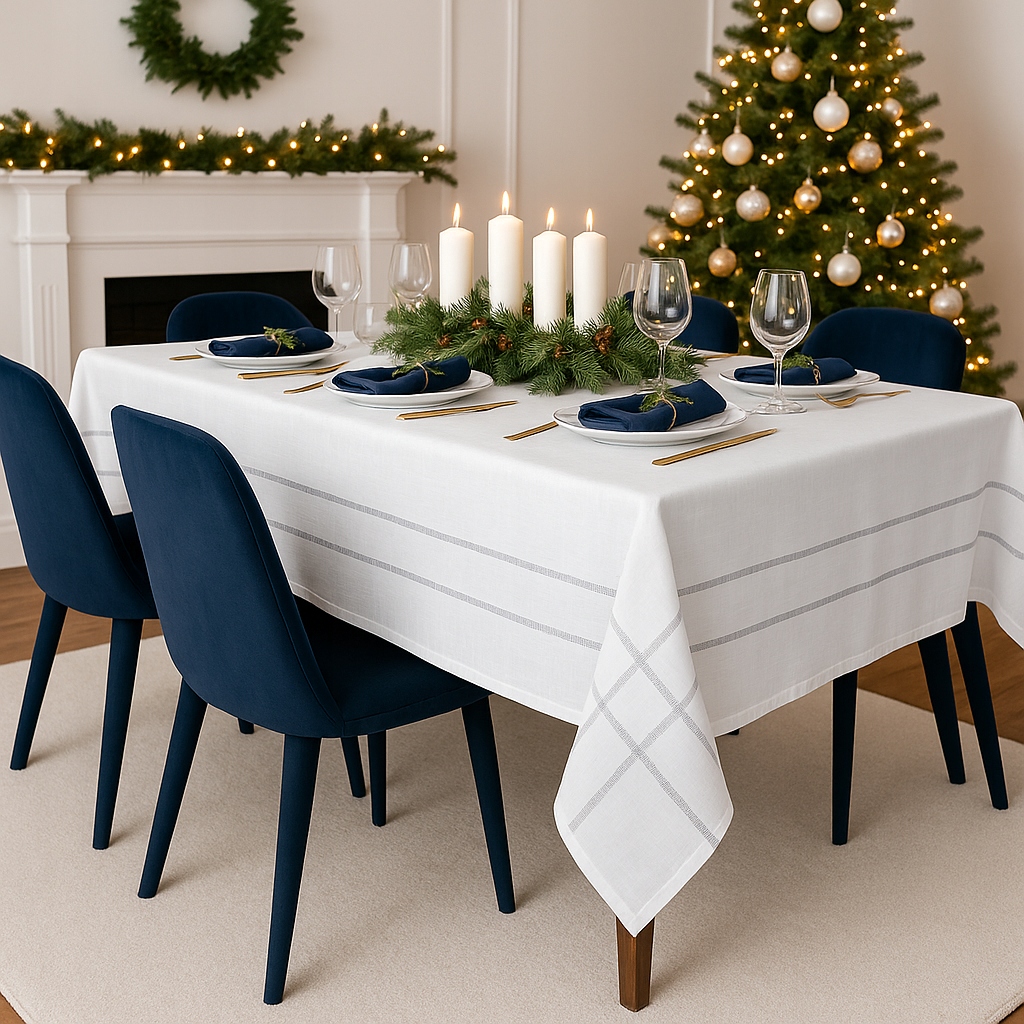 Скатерть изготовлена из высококачественного полиэстера, имитирующего лен, что придает ей натуральный вид и мягкую, приятную на ощупь структуру.