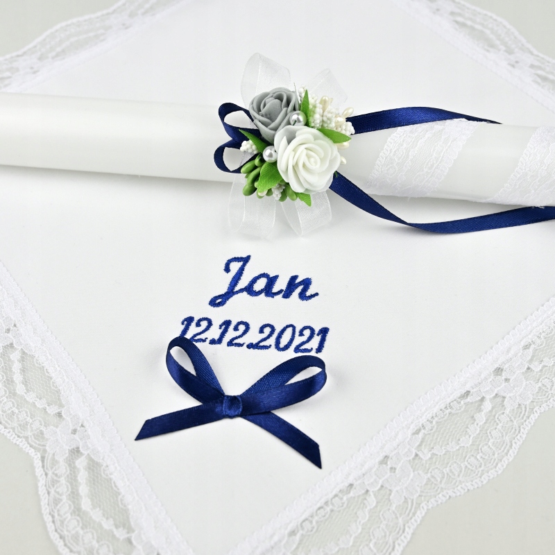 Современная свеча для крещения мальчика с темно-синей длинной лентой и цветочным декором.