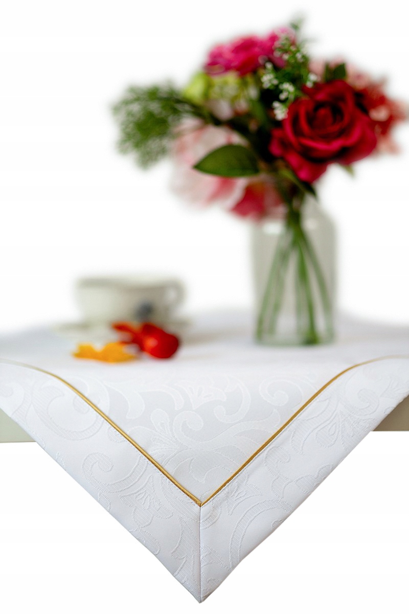 Массивная столовая скатерть, украшенная манжетой с золотой атласной вкладкой. Благородное золото в сочетании со снежной скатертикой будет подчеркнуть уникальный характер таблицы, и в сочетании с золотыми добавками (столовые приборы и посуда) придаст декору реальную элегантность и класс.