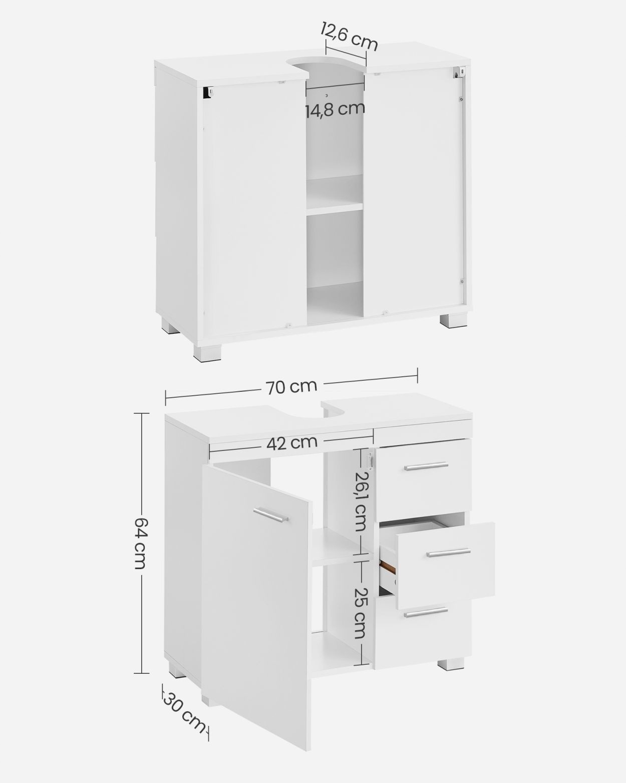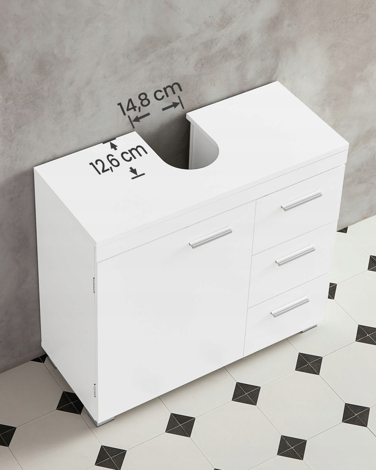 Вместительные 3 ящика позволят организовать и расположить мелкие предметы, такие как полотенца, косметику или чистящие средства, благодаря им ванная комната станет более организованной и все будет легко доступно в одном месте. Дополнительные 2 отделения за дверцей шкафа станут идеальным местом для более крупных или малоиспользуемых вещей, а также вы сможете спрятать вещи, придав ванной комнате опрятный и опрятный вид.