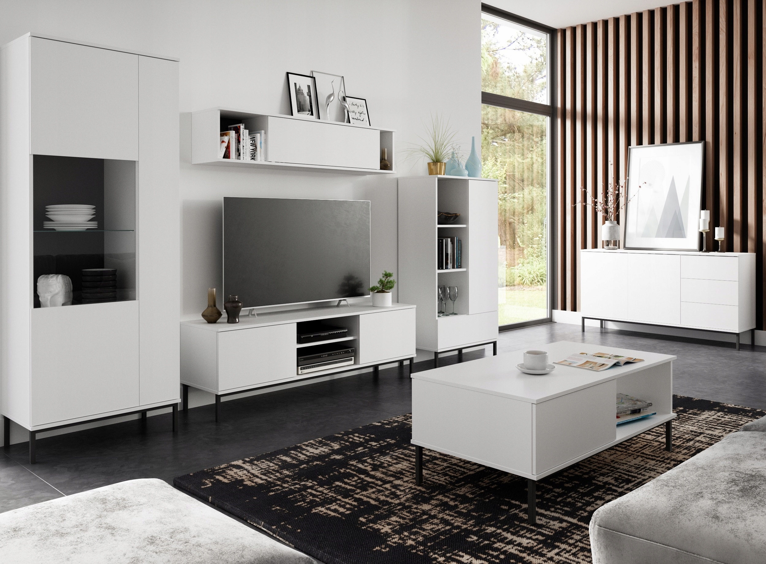 Система состоит из: комода, витрины, полки, тумбы под ТВ, скамьи, полки - подвесной шкаф