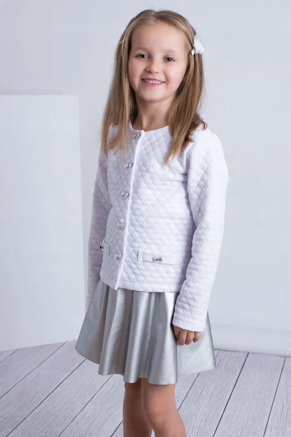 Стильная и элегантная белая куртка для девочки. Изготовлен из блестящего материала с текстурой. Застегивается на декоративные блестящие пуговицы в форме бантиков. . Идеально подходит для особых и торжественных случаев. Он также хорошо впишется в повседневный стиль маленькой модницы. Доступен в розовом и белом цветах и размерах 122–158. Польский продукт.