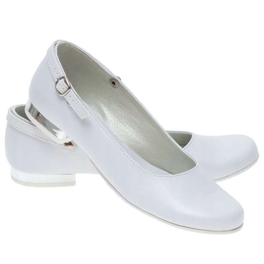 Ballerinas для девочек из производителя обуви Miko из экологической кожи, натуральной кожи. На широкой белой каблуке с серебряными вставками. Закрепленная ремнем, вы можете переместить ремень обратно, если кто -то не хочет его использовать.