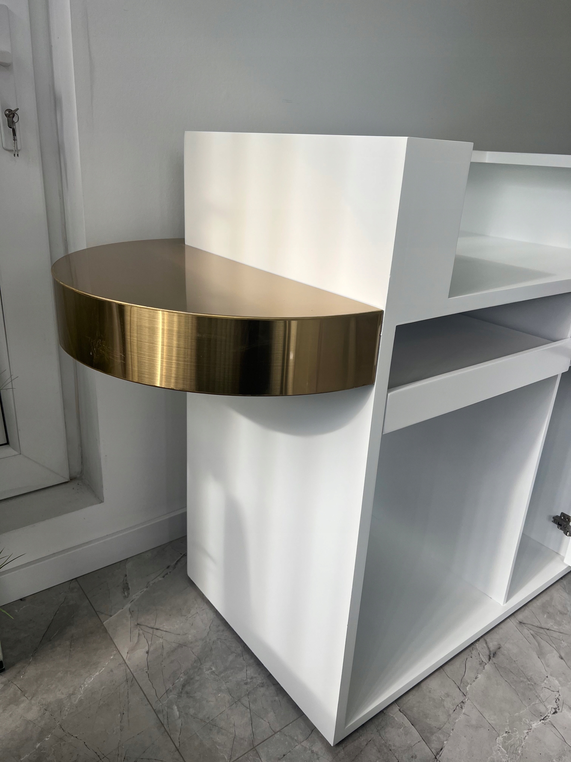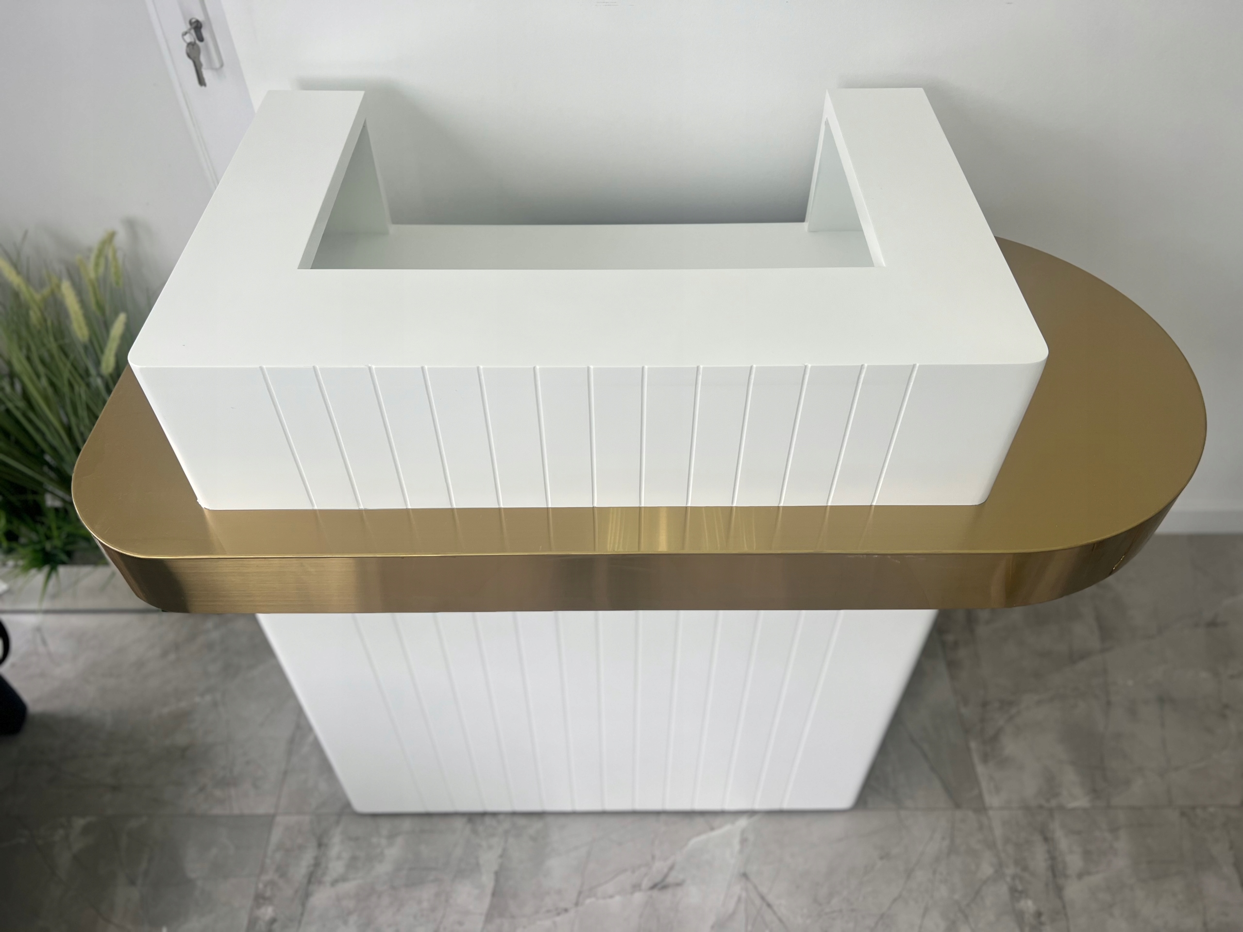 Белая ребристая стойка для ресепшн 130 см с золотым кольцом – элегантность премиум-класса для гостиной