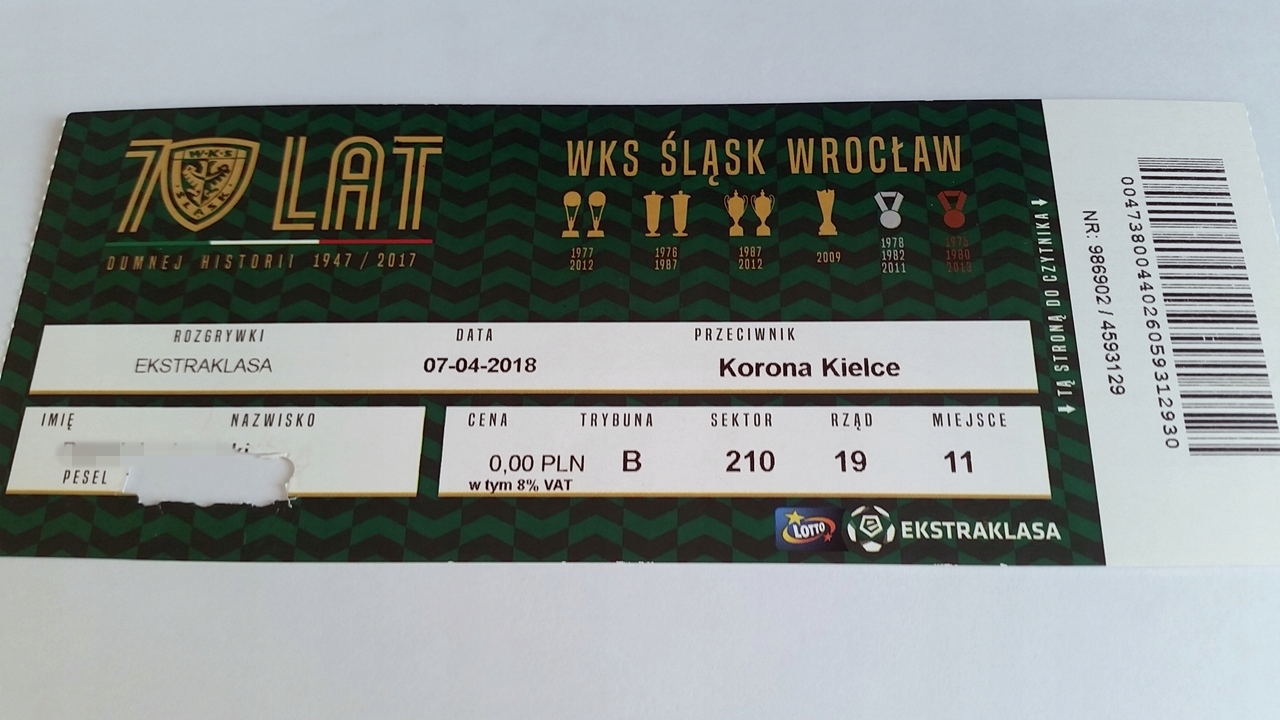 bilet ŚLĄSK Wrocław - KORONA Kielce 07.04.2018