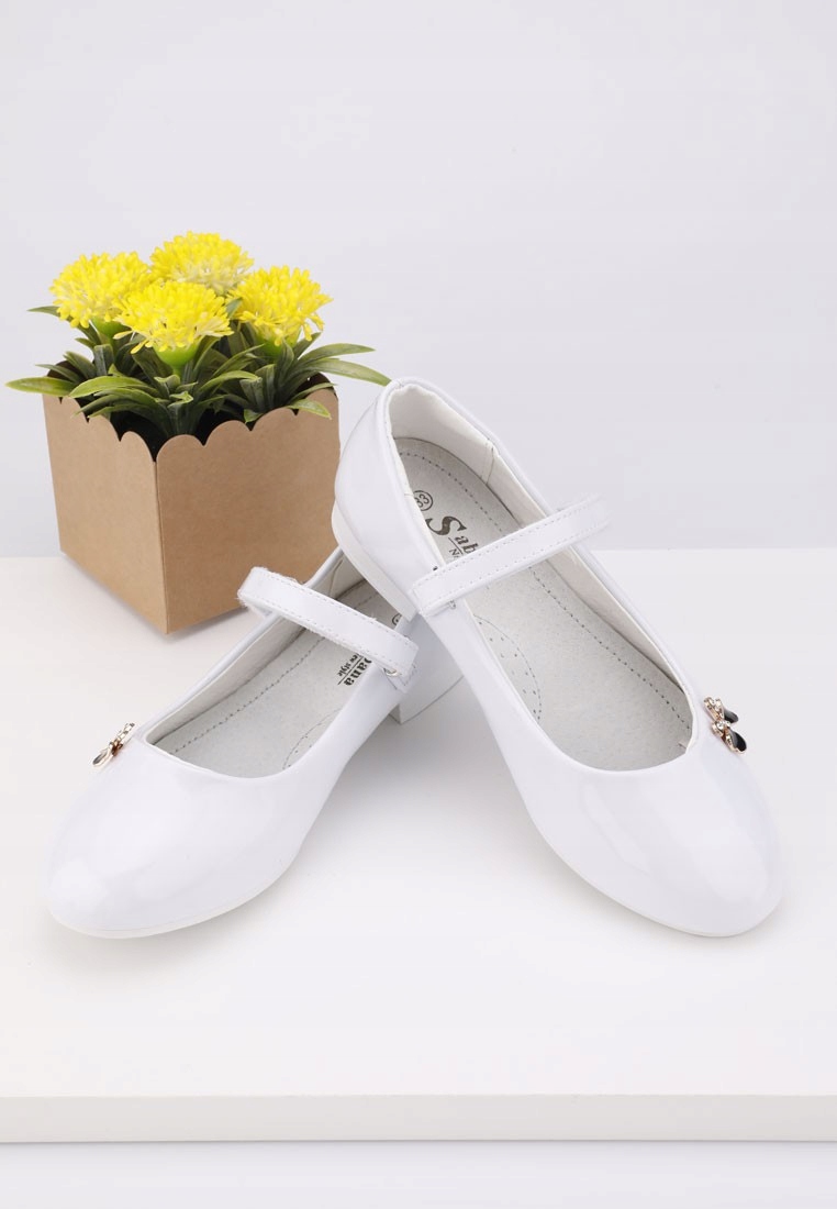 Балерины для девочек, идеальные для первого причастия. Изготовлен из лакированной экокожи. Красивый бантик сбоку туфельки добавляет шарма. нос круглый, застегивается на узкую липучку.