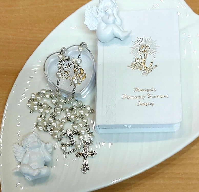 Первое Святое Причастие – очень важный праздник для всех верующих, а не только детей, которые впервые будут участвовать в полном Таинстве Евхаристии. Неотъемлемым элементом этого прекрасного момента являются четки. Предлагаемое нами изделие станет прекрасным сувениром на долгие годы, напоминая вам об этом важном моменте в вашей жизни. В соединительном медальоне изображена чаша с Гостией. Розарий Первого Причастия, представленный на нашем сайте, станет прекрасным подарком, увенчающим этот торжественный момент в жизни молодого католика.
