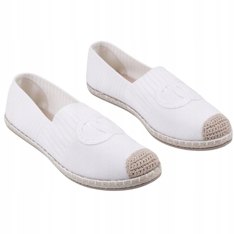 Эспадрильи скользили, с низким верхним верхним количеством перед лодыжкой. Установлен на плоской подошве, окруженной оплеткой из джута. Сделано из текстильного материала. Нос дополнительно укреплен с вставкой косички. Вставка сделана из Eco -Leather.
