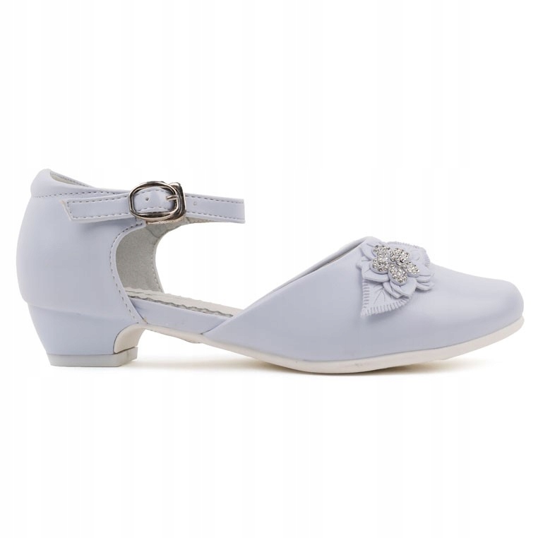 Туфли для причастия для девочек на невысоком каблуке 3 см. Круглый нос. Спереди декоративный цветок, украшенный блестящими цирконами. Тапочки с открытым пространством между пяткой и пальцами. Застегивается на узкий ремешок с застежкой. Оттенок туфель синий. Элегантная обувь для торжественных случаев.