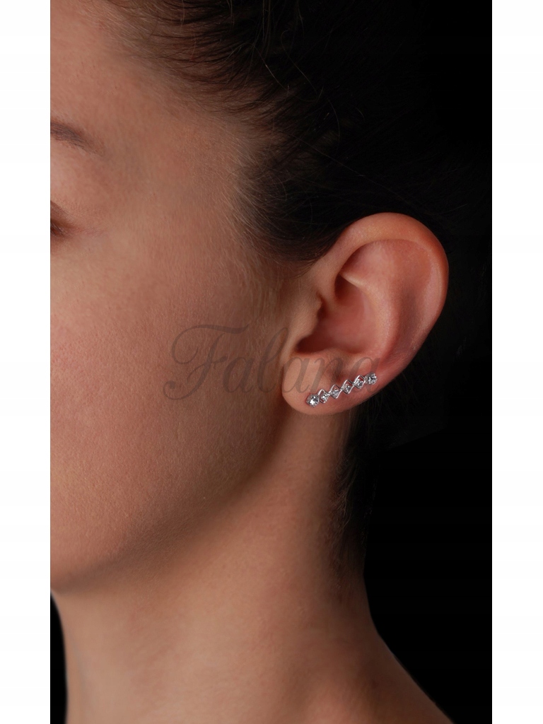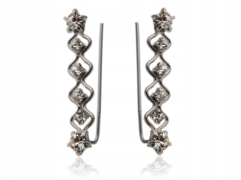 Серьги из серебра 925 пробы. Проволока за ухом тонкая и гибкая, поэтому плотно прилегает к уху. Украшение декорировано круглыми кристаллами, которые красиво сверкают на свету. Кристаллы закреплены серебряными когтями, благодаря которым они надежно удерживают серьгу.