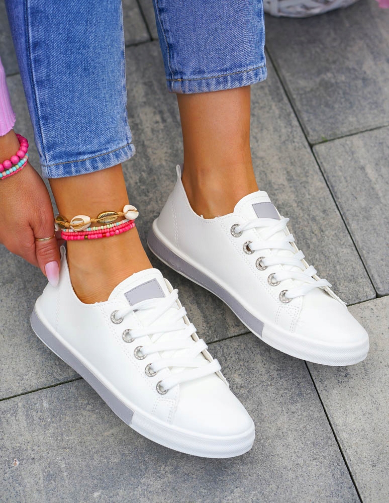 - Белые кроссовки полностью из мягкой экокожи.