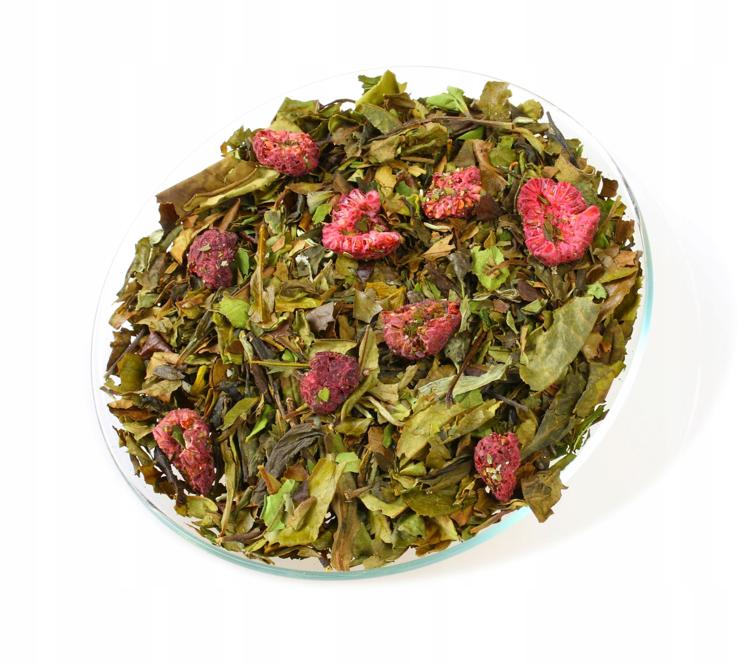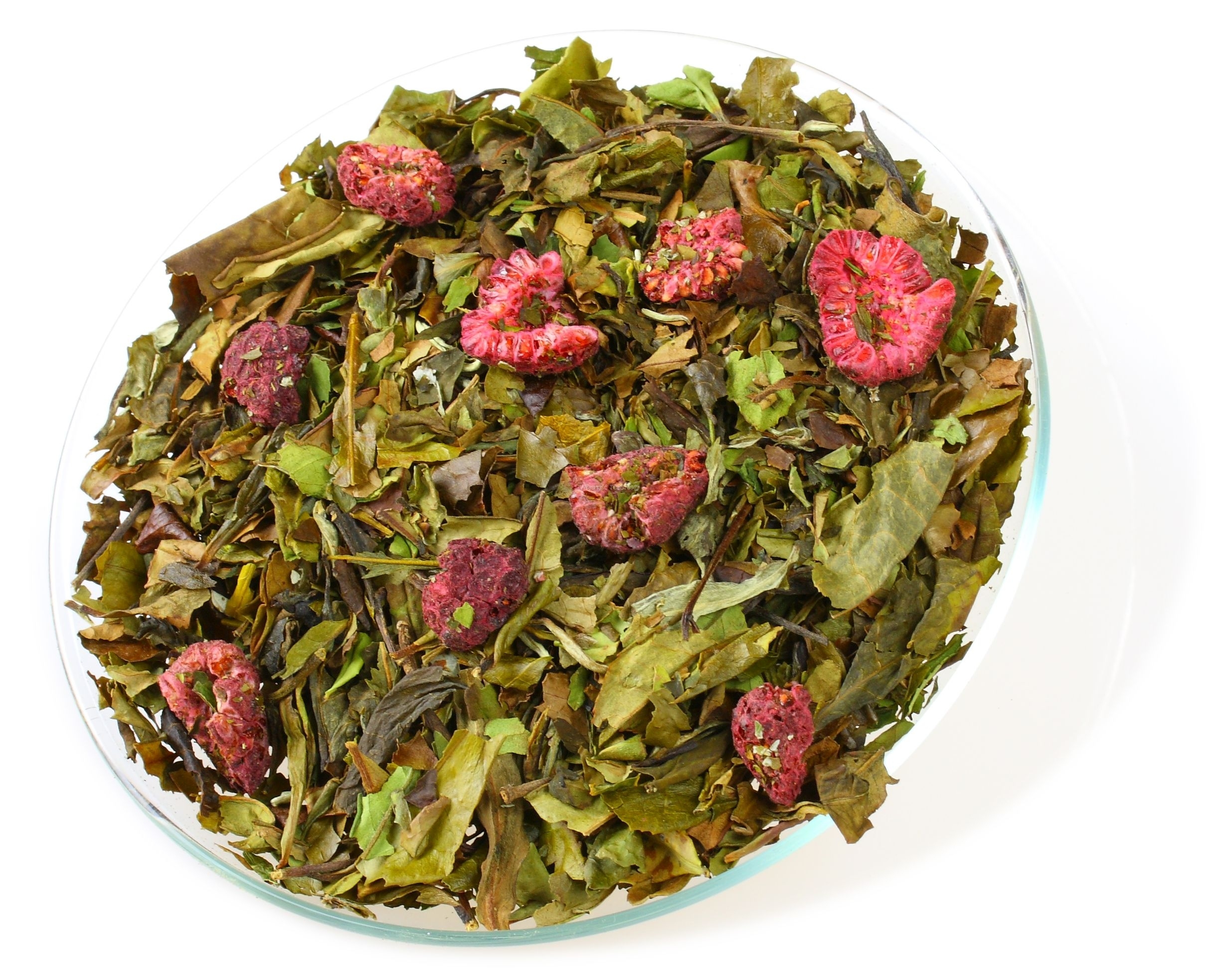 Белый чай Pai mu tan, обогащенный малиновым ароматом и цельной малиной. Аккуратно фруктовый и очень приятный по вкусу. Это отличный напиток для всех, кто хочет использовать свойства здоровья белого чая и насладиться гораздо более выраженным вкусом, чем в случае естественного чая. /b>