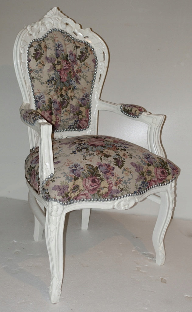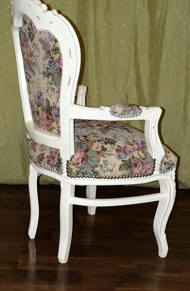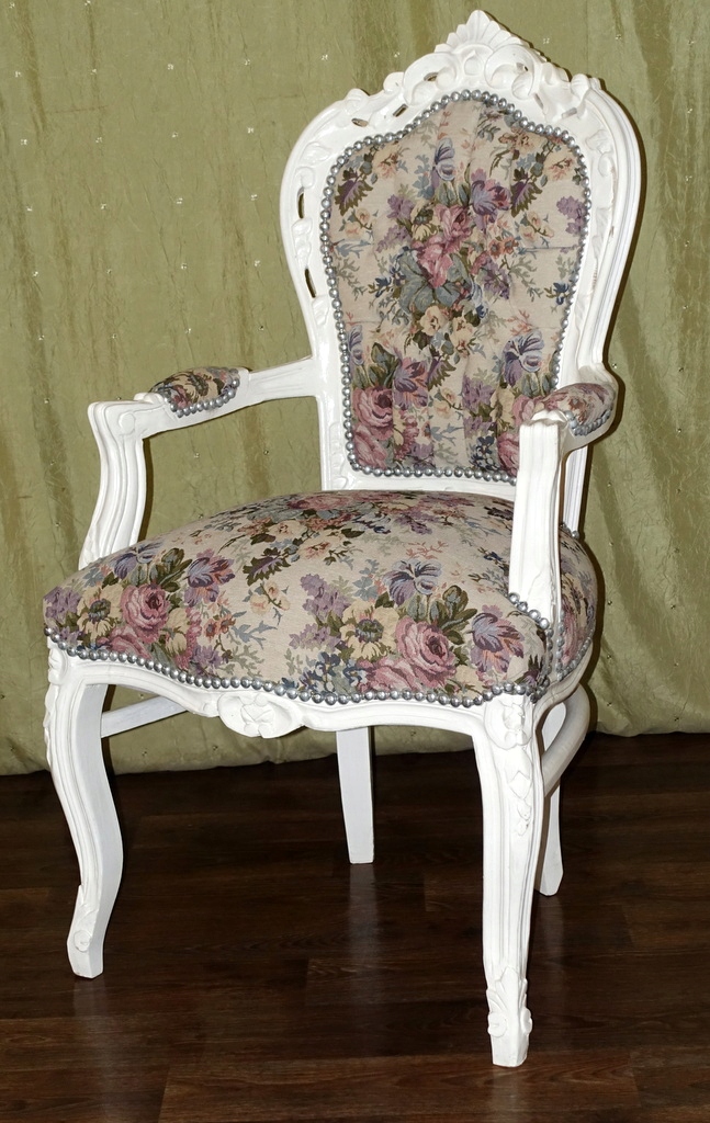 Стильный стул в стиле барокко с подлокотниками. Новая, не бывшая в употреблении мебель, выполненная в современном, старинном стиле, выглядящая под старину. Дерево античного белого цвета. Гобеленовая обивка с яркими цветами, отделанная эстетичной декоративной булавкой.