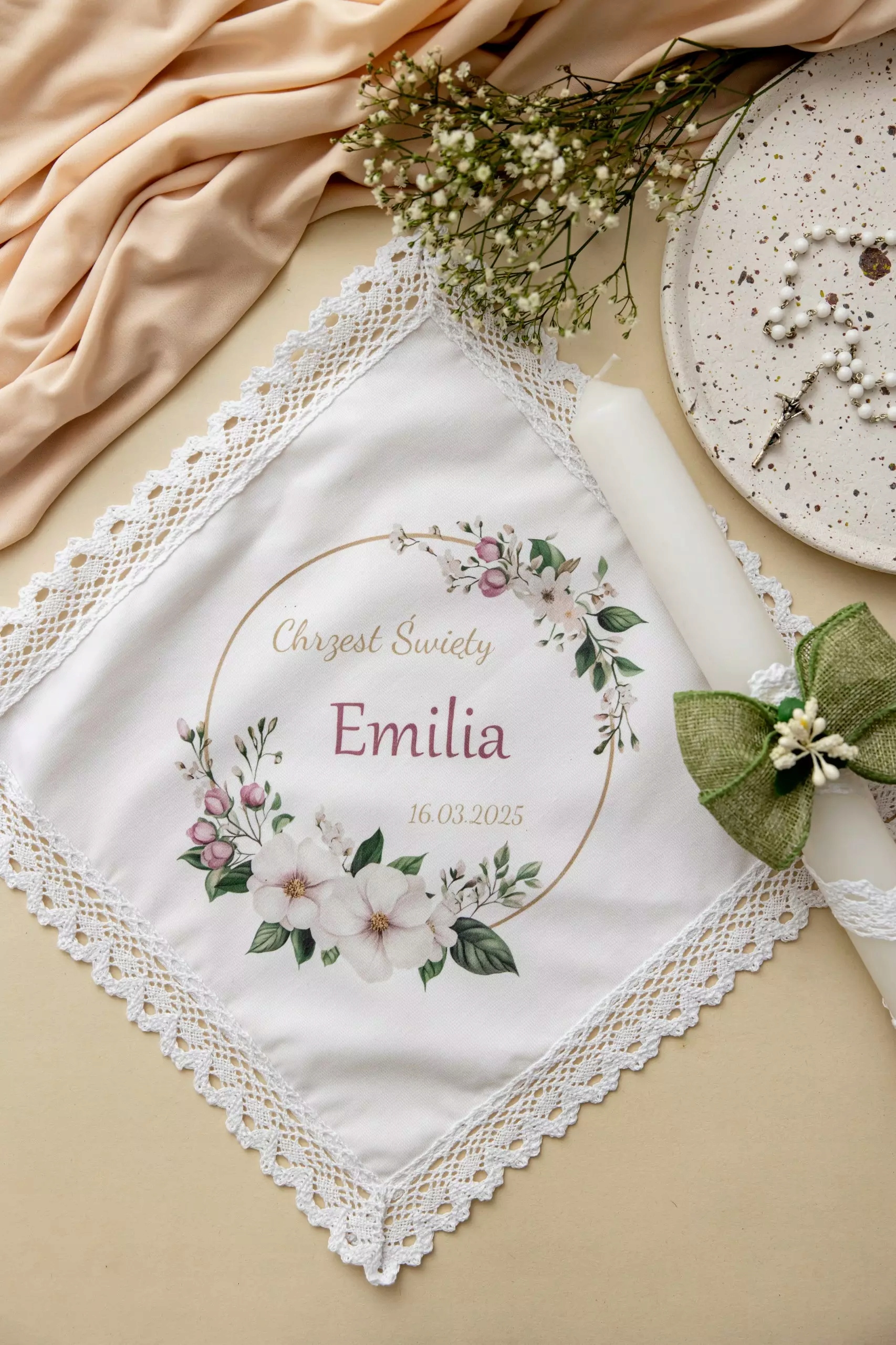 ✔ благодаря удобному размеру и световому материалу его можно легко положить на ребенка во время церемонии.