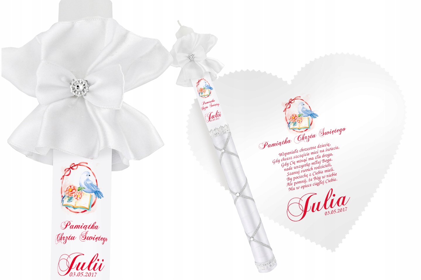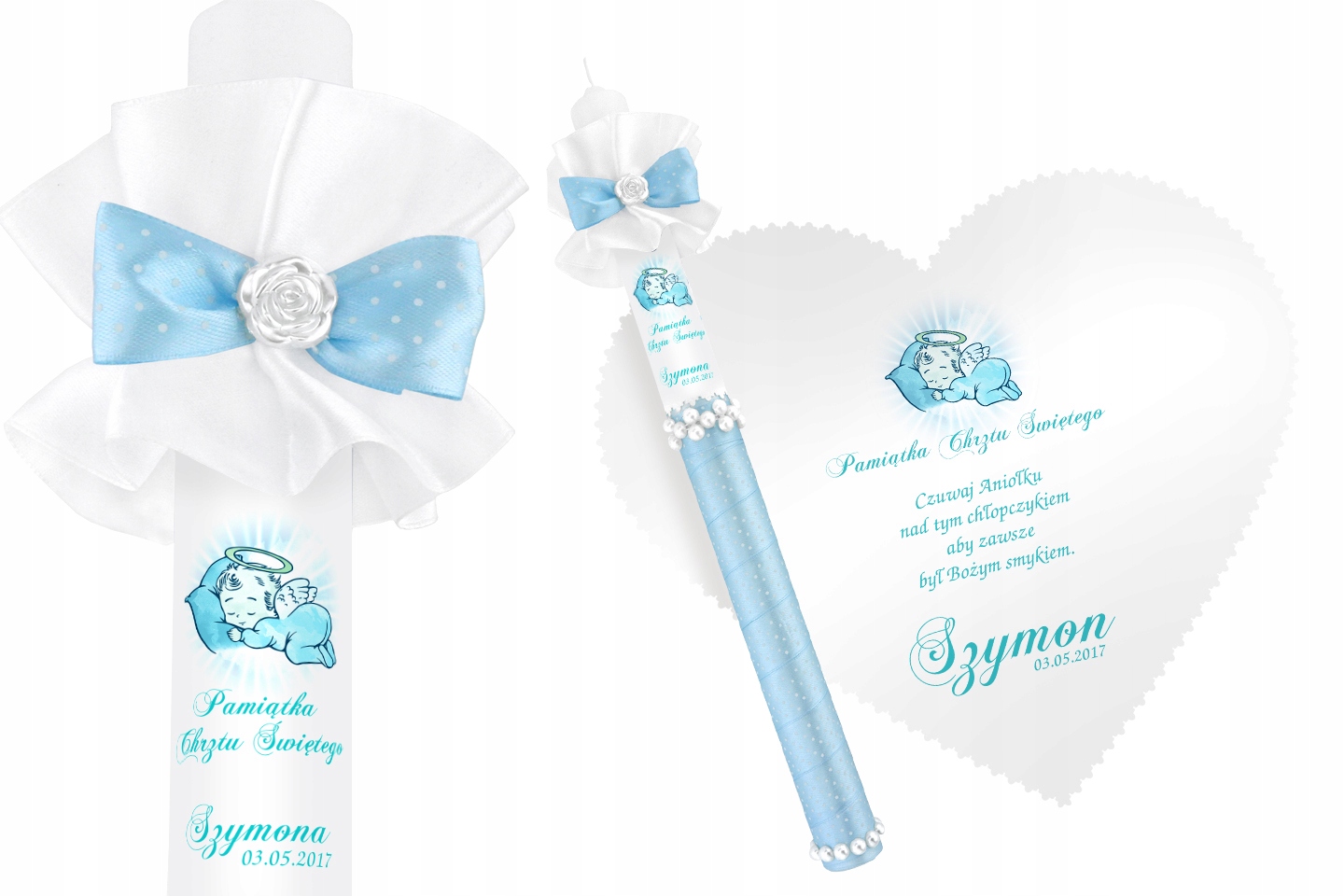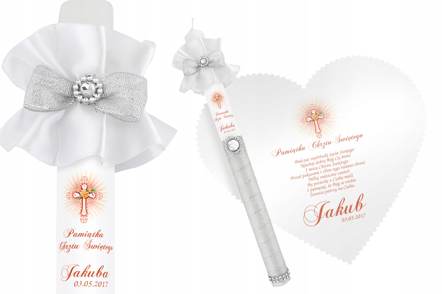 Элегантные наборы из свечей и крестильных халатов. Мы представляем десять комплектов в различных аранжировках. Каждый из них посвящен ребенку, которому предстоит Святое Крещение. Вы найдете стили, предназначенные для мальчиков и девочек. Декоративные элементы всех комплектов делают крестильную одежду и свечу очаровательным сувениром Святого Крещения. Настоящим сюрпризом станет белый крестильный халатик с именем ребенка. В комплект входит свеча с именем и датой Крещения. Это, безусловно, придаст всему этому уникальный характер. Посвятите набор для крещения, указав имя и дату церемонии, а также посвящение или пожелания. Выразительный принт сохранит свой вид на протяжении многих поколений. Соответствующая графика слегка отличает каждый набор, поэтому вы можете легко выбрать один из них. Свечи – это мастерство ручной работы, которое порадует каждого человека.