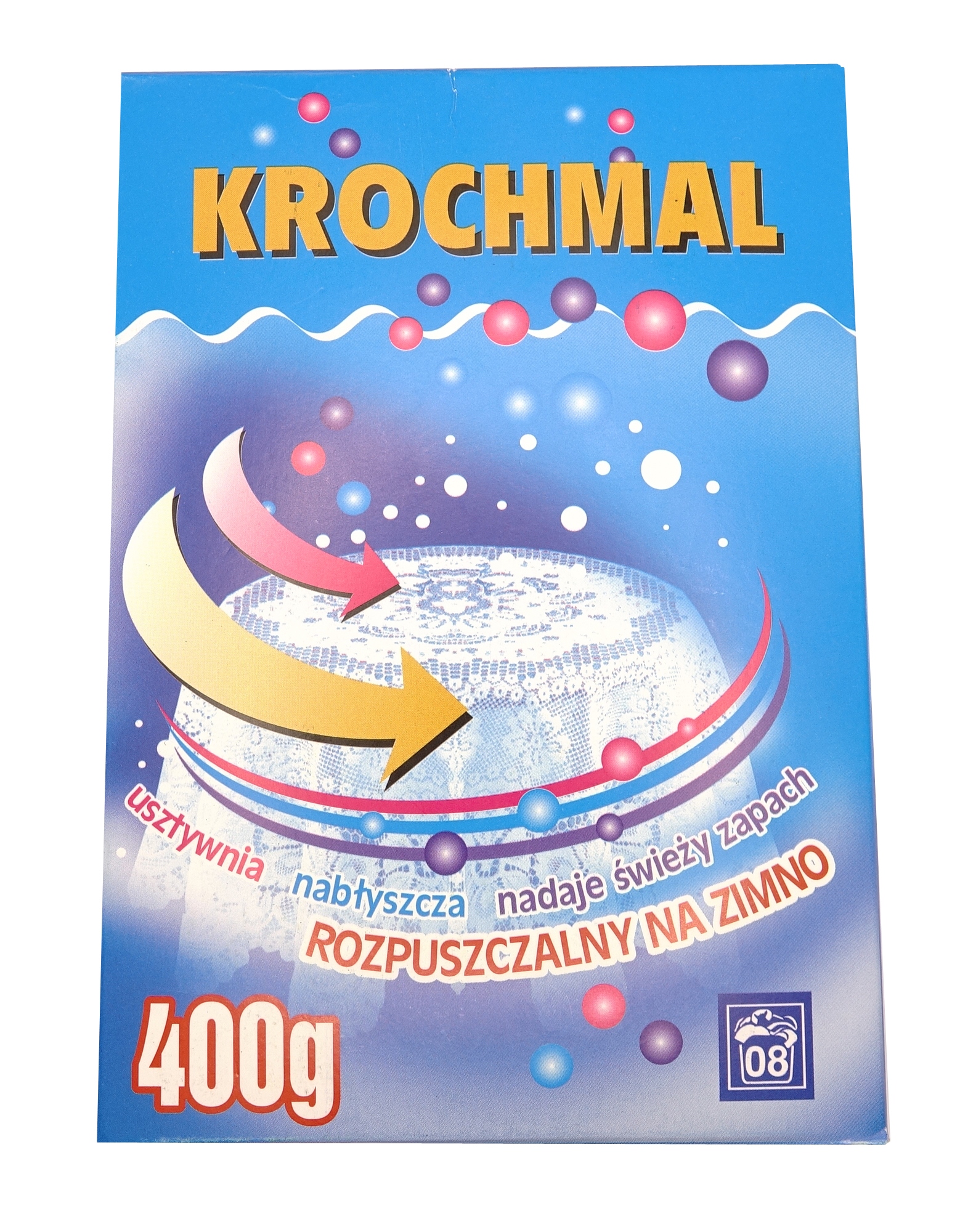 , предназначенный для крах, в автоматических, стиральных машинах -ротора и для ручного крахмала. Он легко растворяется в холодной воде, содержит добавки, которые облегчают гладение. Отложите около 10 минут. Разбавьте приготовленный раствор холодной водой и вылейте в стиральную машину и включите программу «Крочмальния» или «Последнее полоскание». Не смывайте