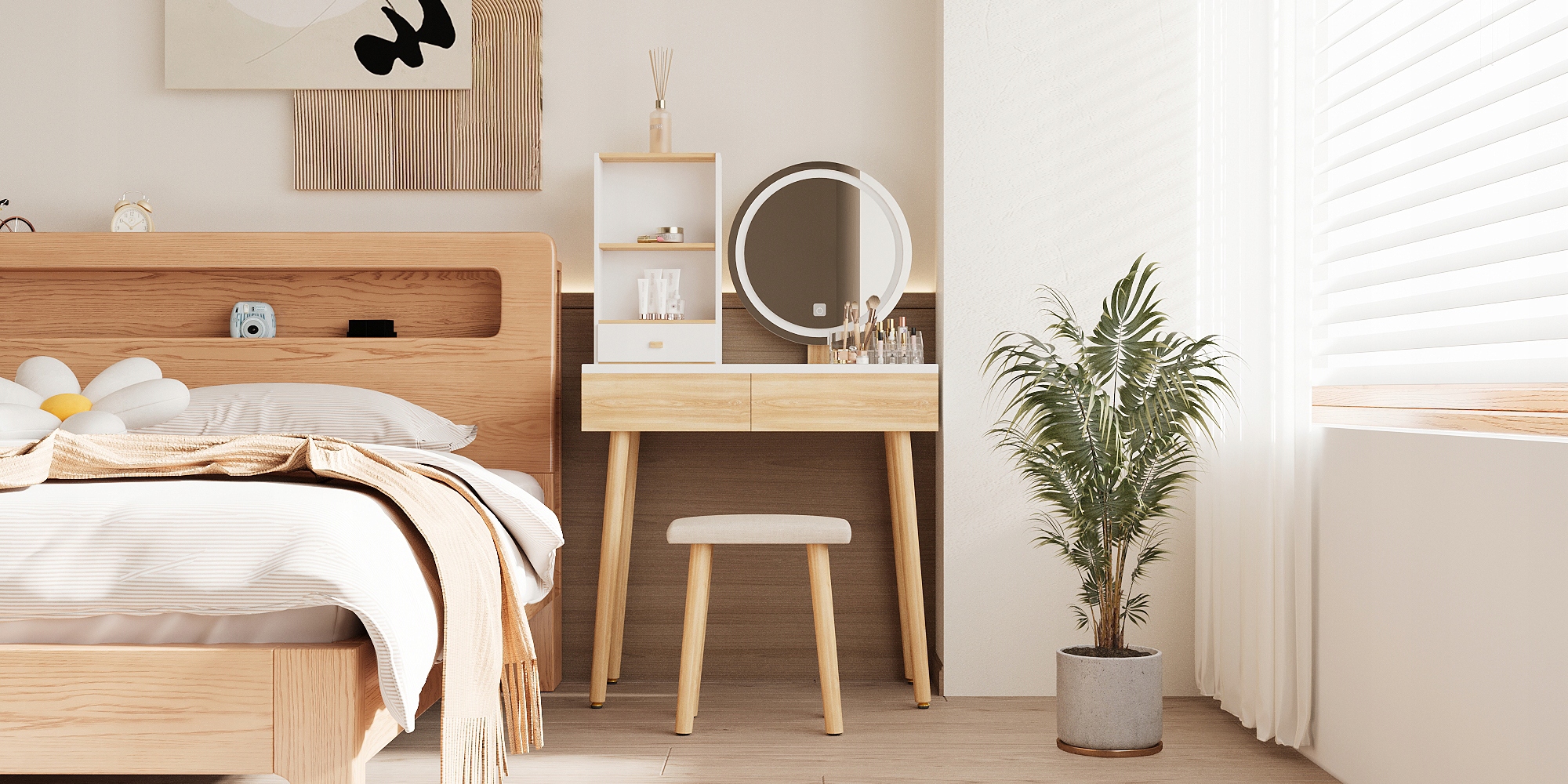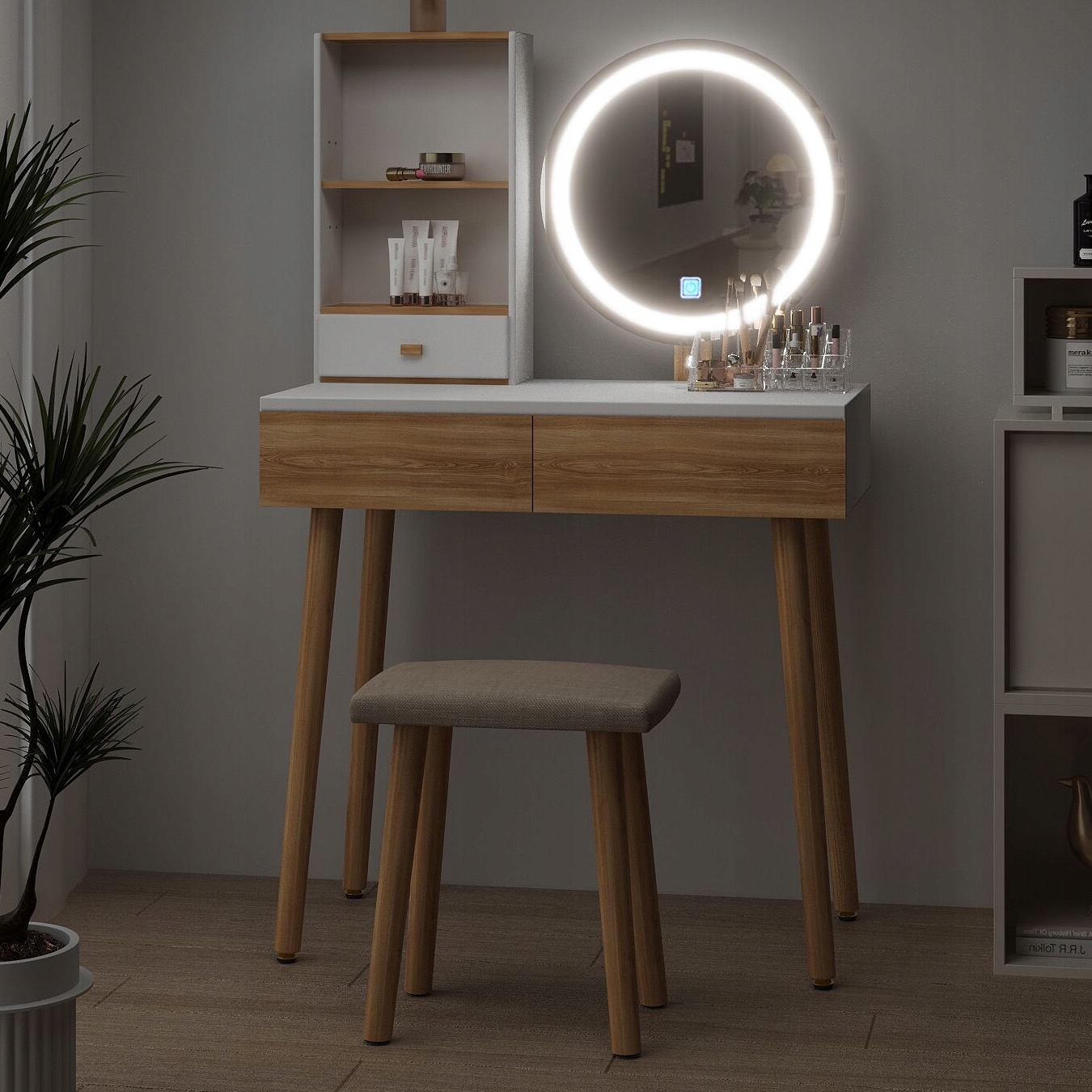 Белый косметический туалетный столик с деревянным светодиодным зеркалом