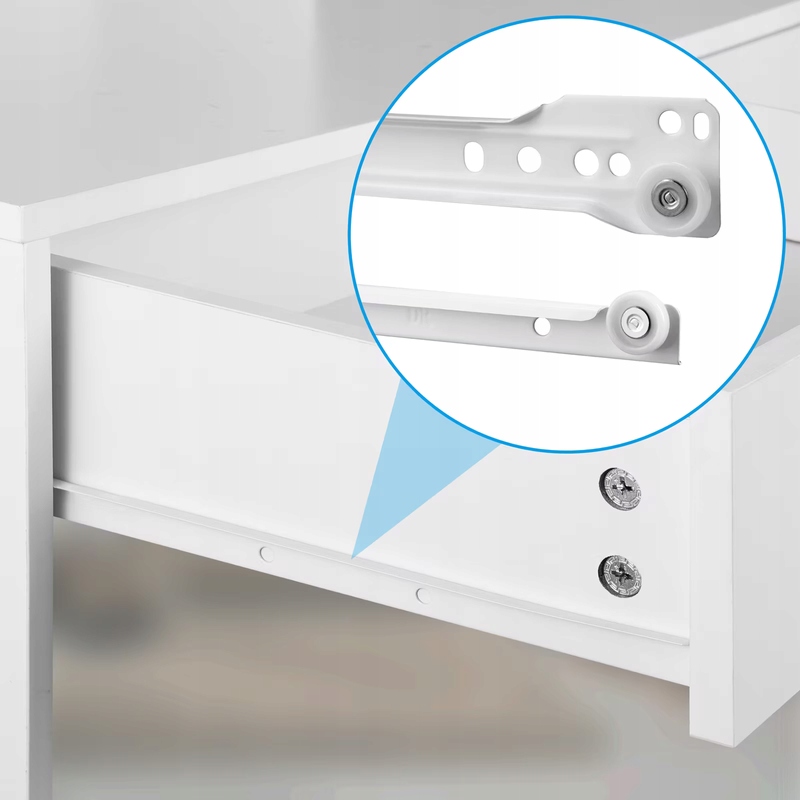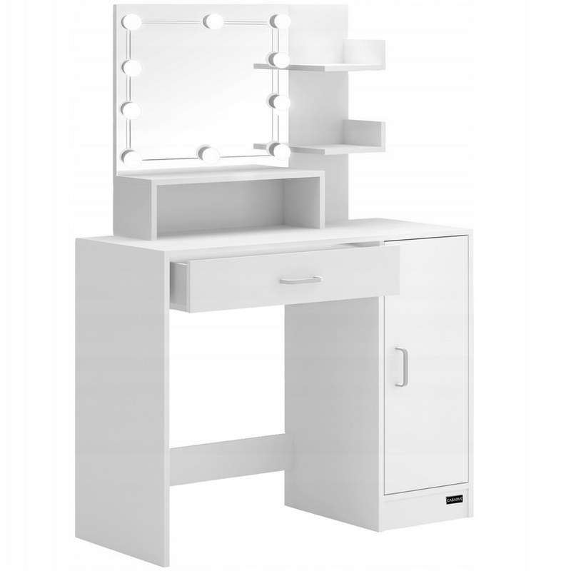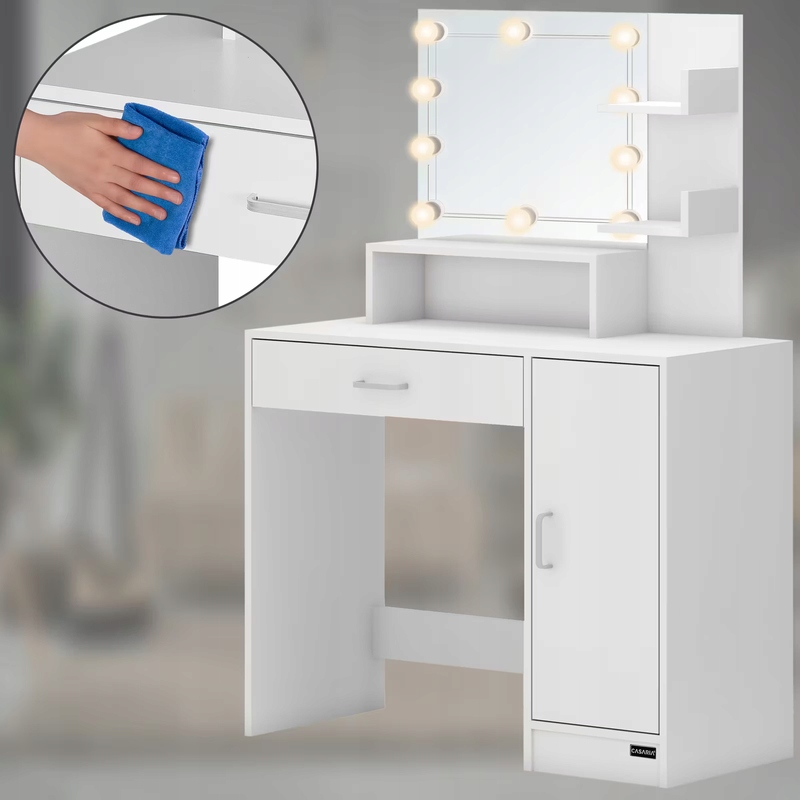 В ящике есть лампочка, которая включает и выключает датчик расстояния. Благодаря плавно движущимся металлическим направляющим ящик легко открывается. Средства для укладки или парфюмерию можно представить на 2 дополнительных полках и 1 отделении на большом зеркале. Туалетный столик изготовлен из прочной плиты МДФ, окрашенной в белый цвет. Простые в уходе поверхности туалетного столика при загрязнении можно протирать мягкой влажной тряпкой. Для защиты пола к ножкам туалетного столика крепятся напольные протекторы. Это предотвращает появление царапин. Туалетный столик можно быстро и легко собрать, используя прилагаемую инструкцию по сборке. Для еще большей устойчивости туалетный столик имеет возможность заднего крепления, благодаря чему изделие можно прикрепить к стене. Это предотвращает опрокидывание продукта. Светодиодные лампы можно регулировать по десяти уровням и доступны три режима освещения: теплый белый, естественный белый или белый. Светодиодные лампы можно подключить к источнику питания через USB-кабель.