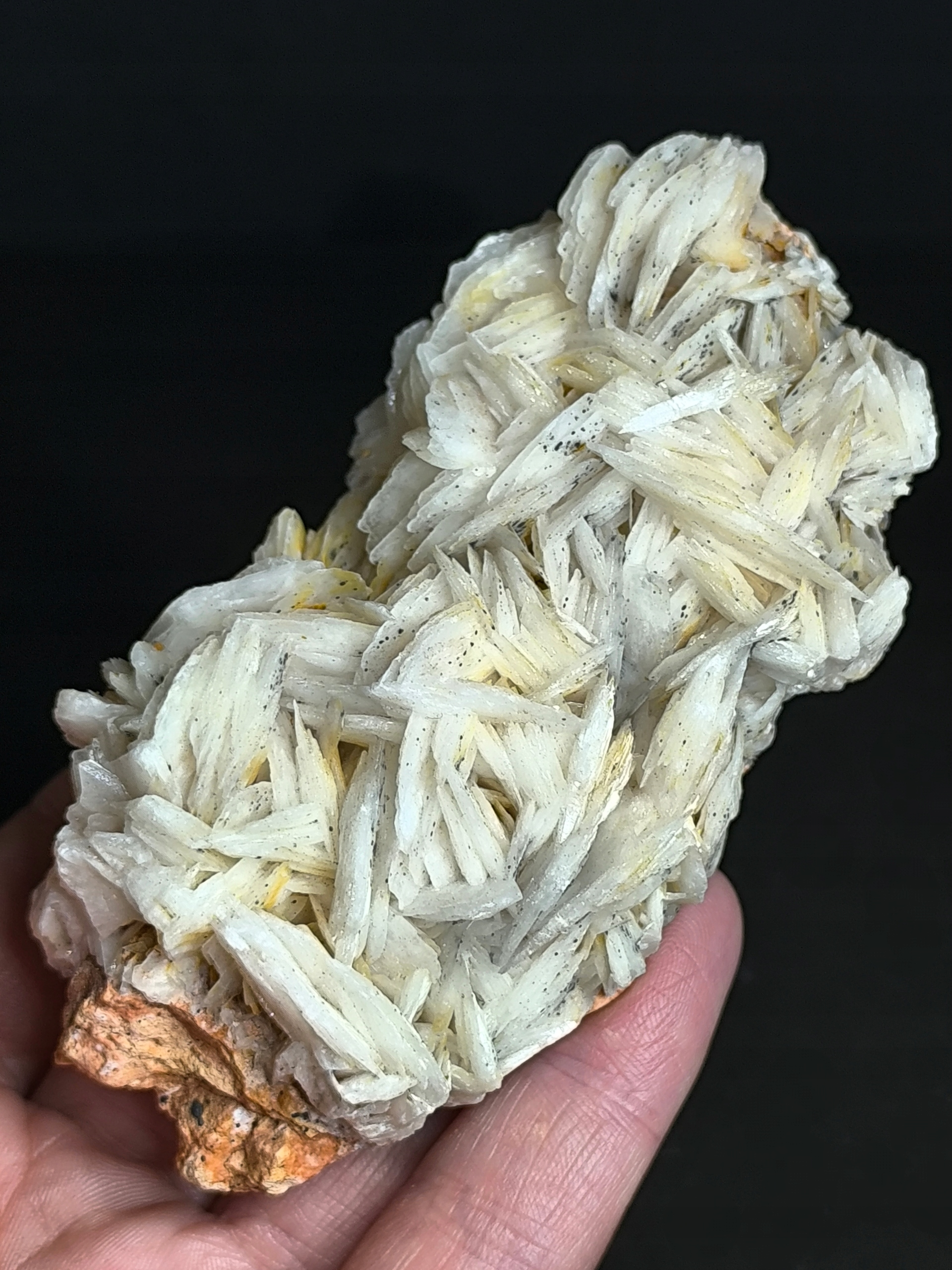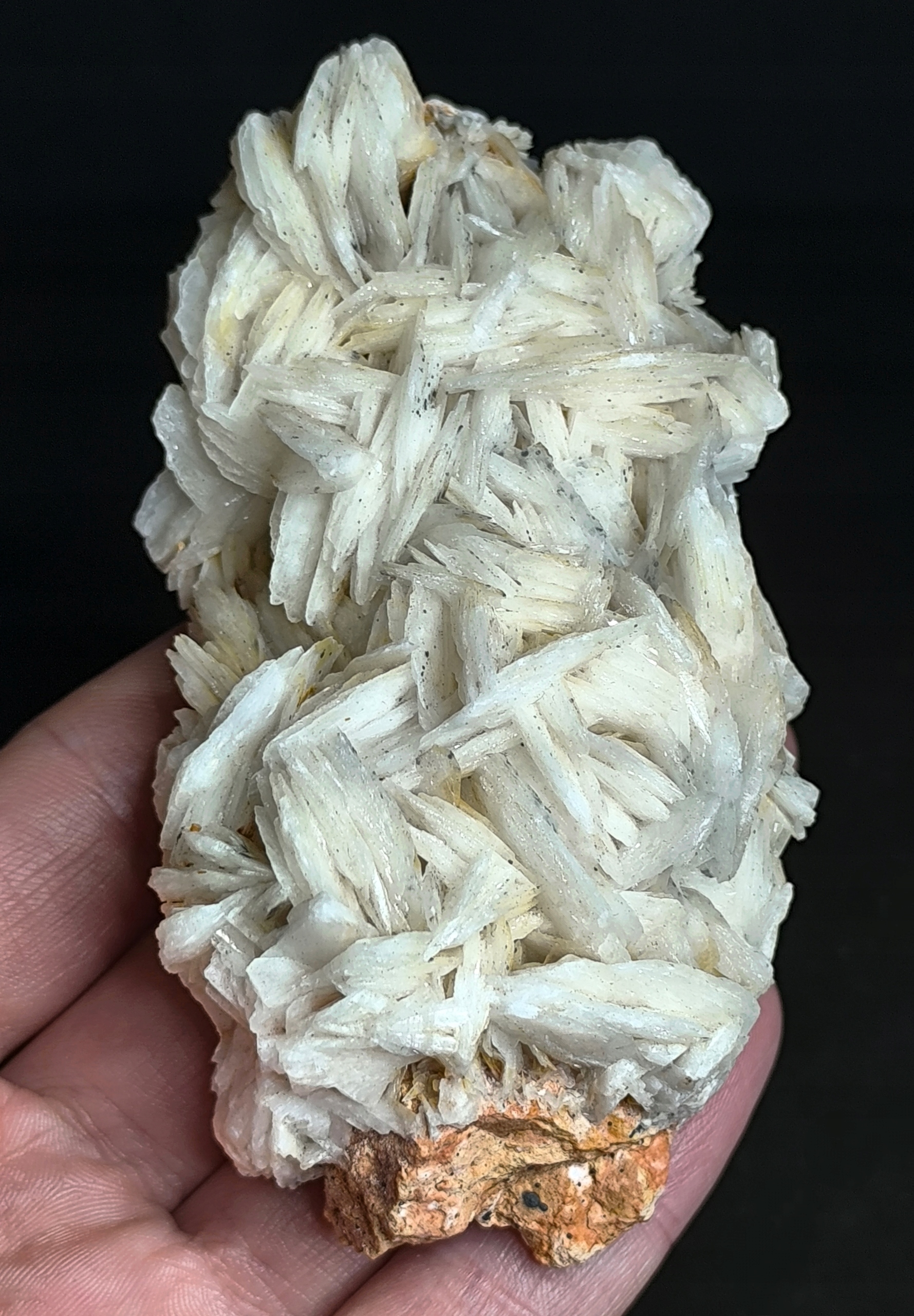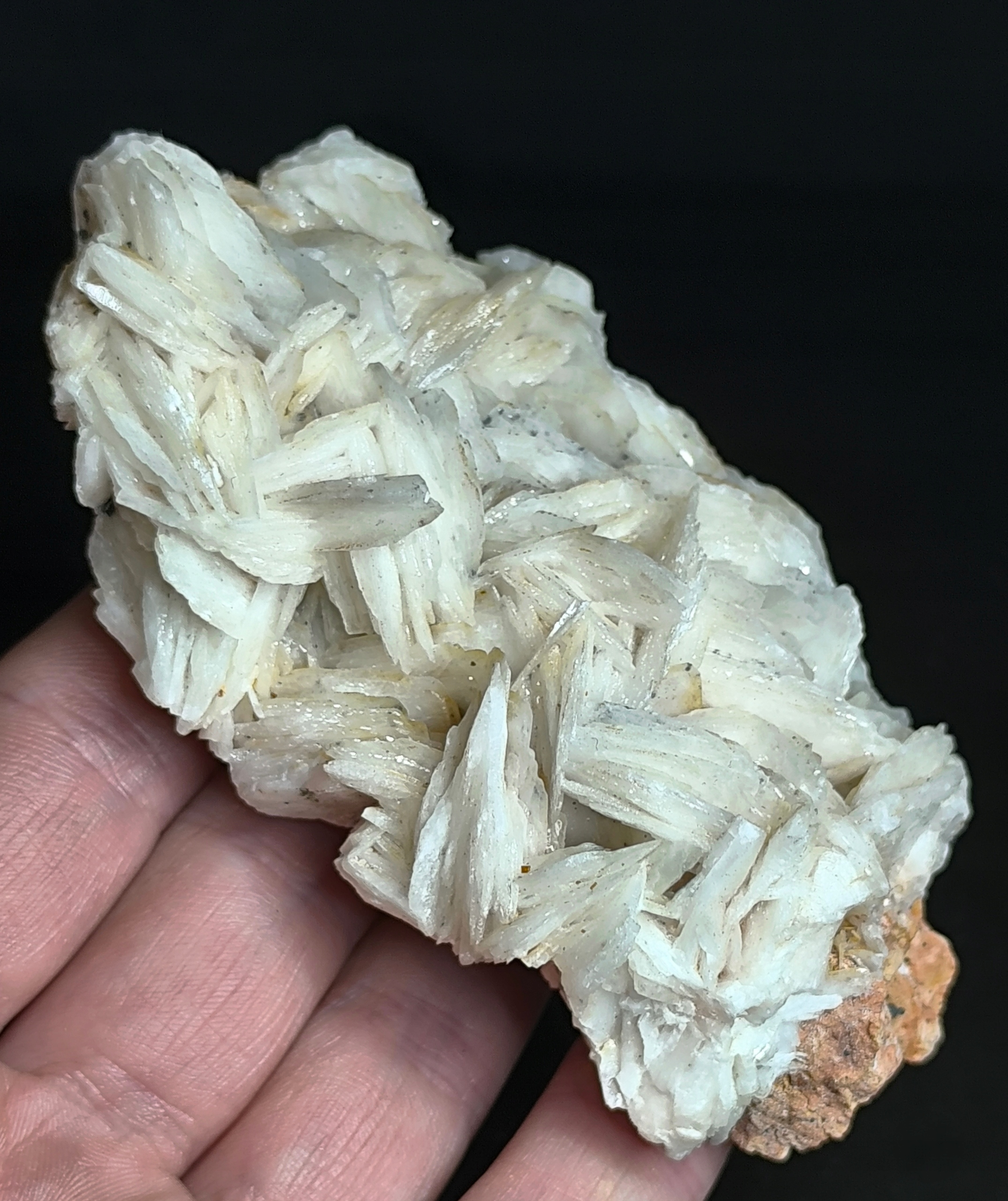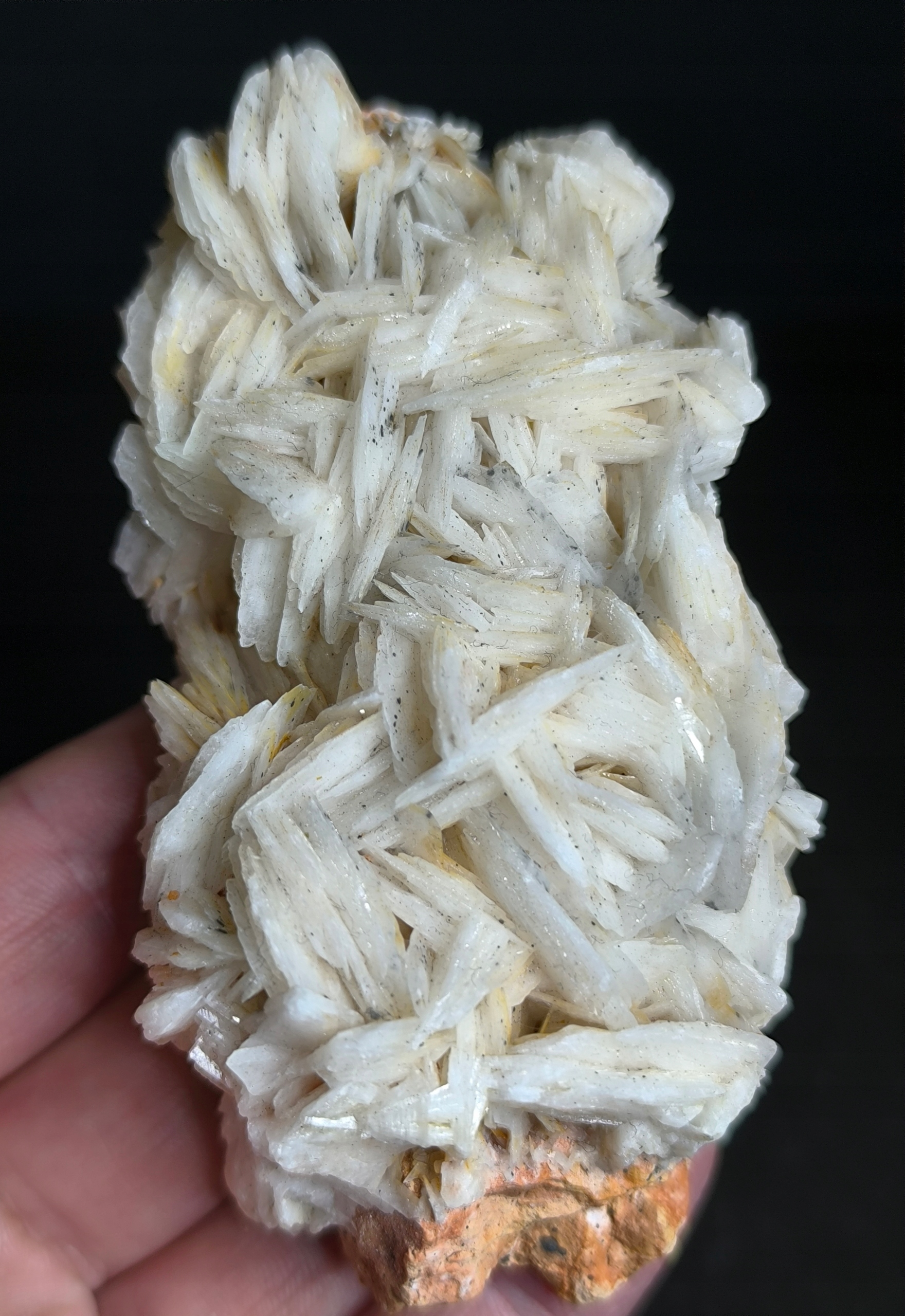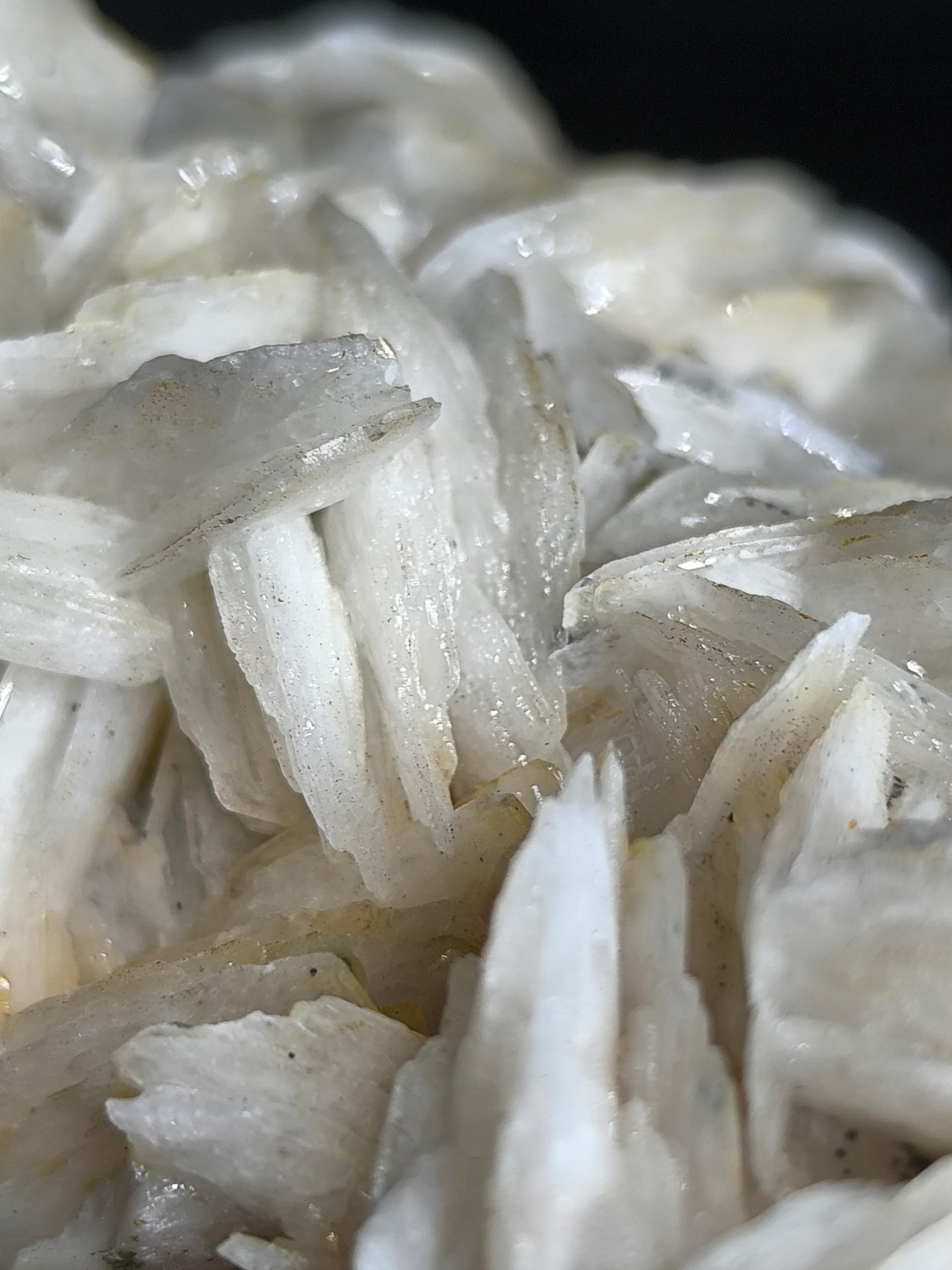 Уникальный образец белого барита с сильным блеском, состоящий из плотно расположенных кристаллов, образующих привлекательные веера.