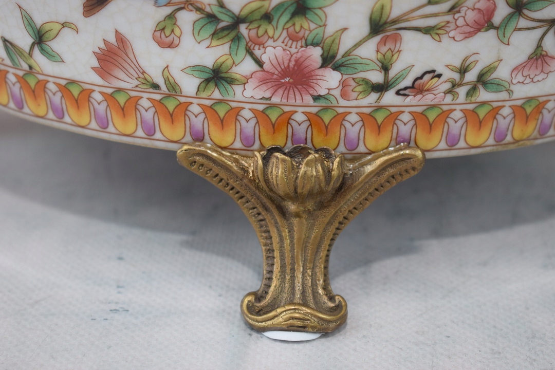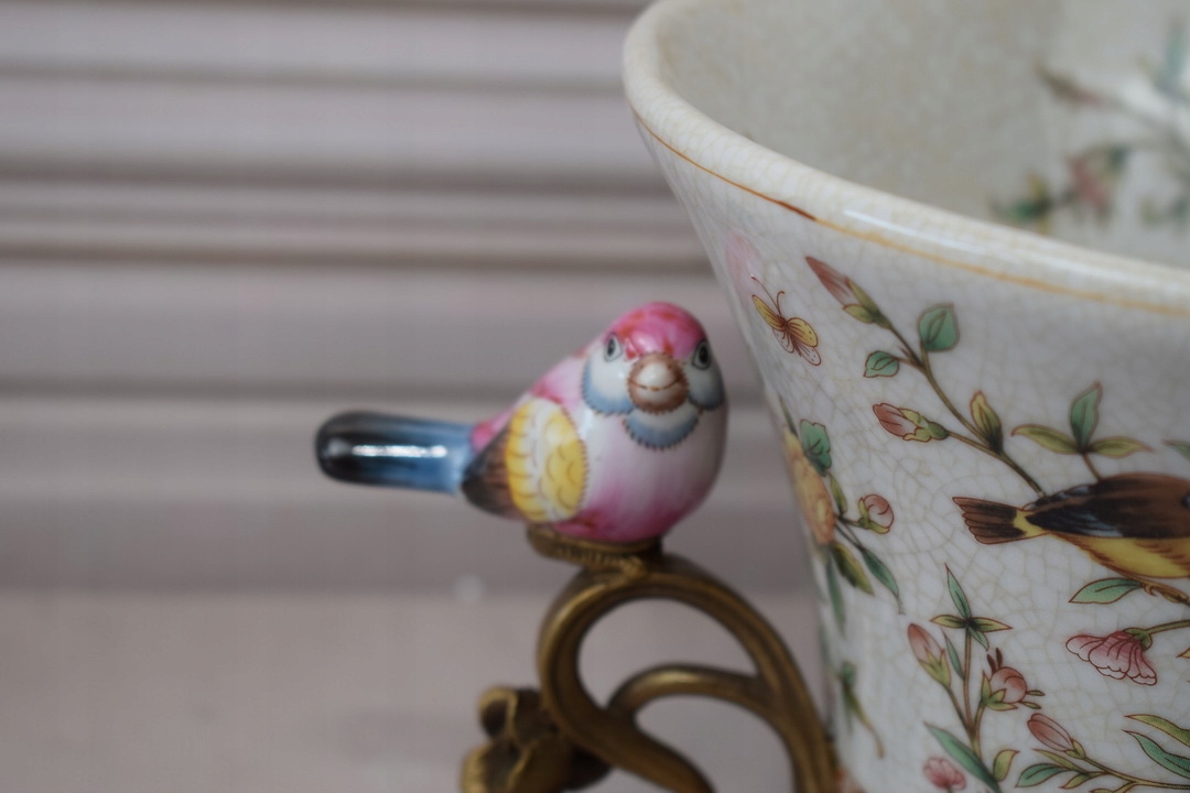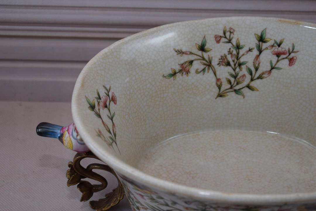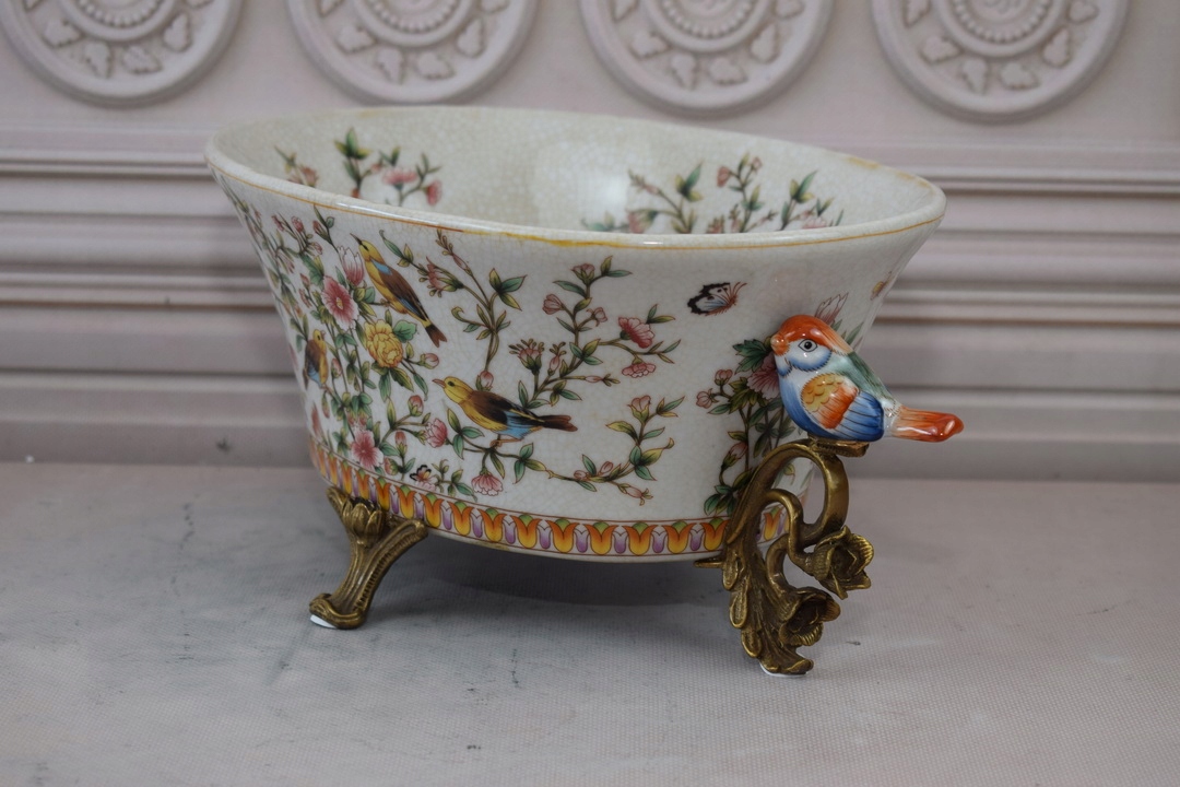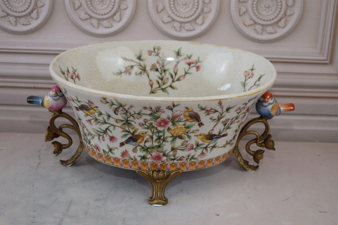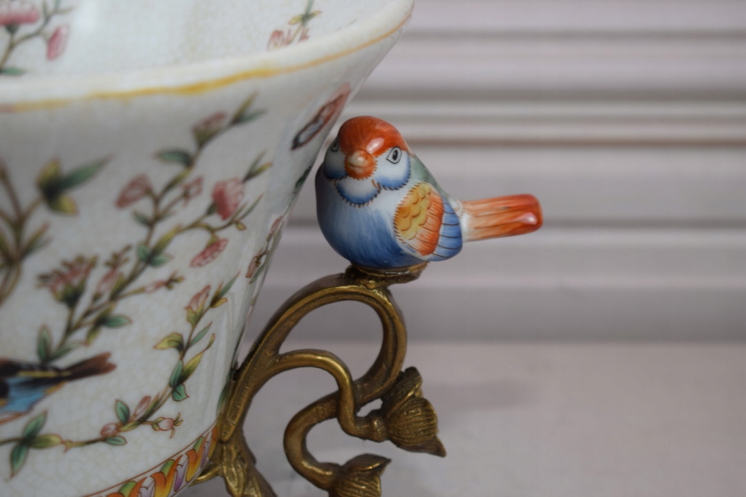 Белая фарфоровая патера - птицы и цветы - фарфоровое + коричневое - украшение