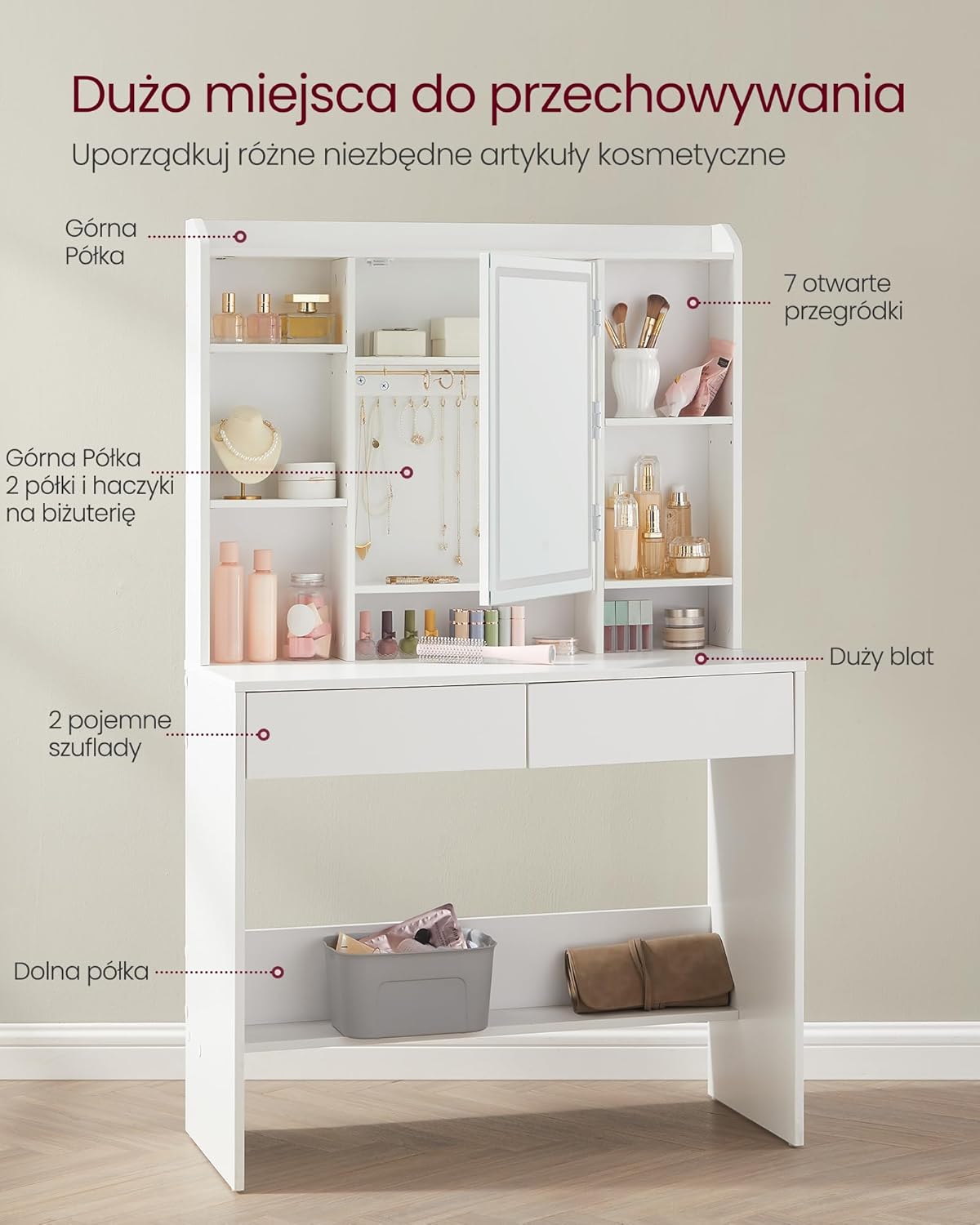 ❤️Просторно и аккуратно – 1 полка для парфюмерии, 7 открытых отделений для косметики, 2 полки и крючки для украшений, спрятанные за зеркалом, 1 большая полка, 2 ящика и 1 нижняя полка