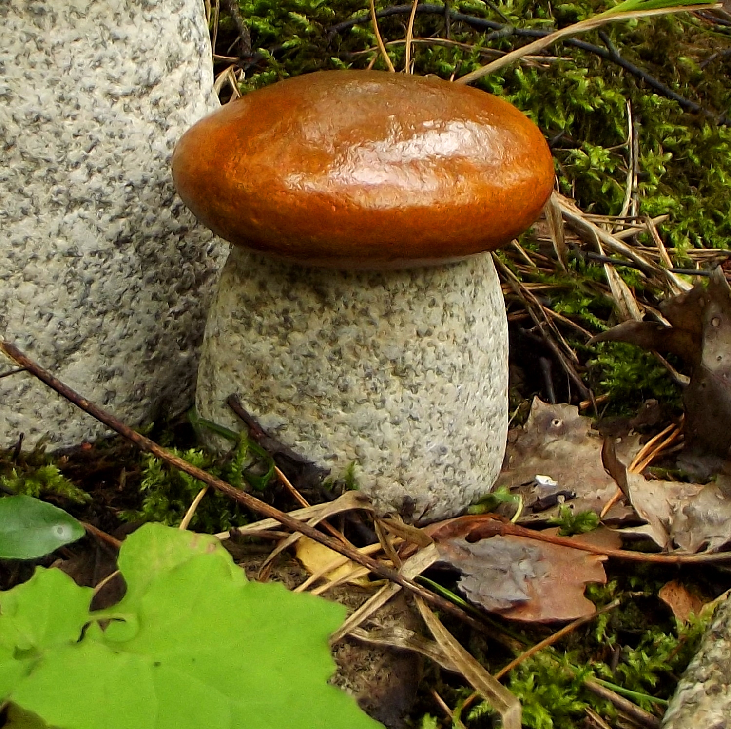 Гриб из натурального камня (гранита). Фигурки прочные и устойчивые к погодным условиям, могут зимовать в саду. Форма камней, сформированная природой, делает каждый гриб уникальным. Размещенные в саду под туями, хвойными деревьями, на альпинарии или на коре, они выглядят как настоящие. Вес гриба от 1кг до 3кг, высота от 12см до 18см. На других аукционах есть грибы поменьше, других цветов и много оригинальных фигурок.