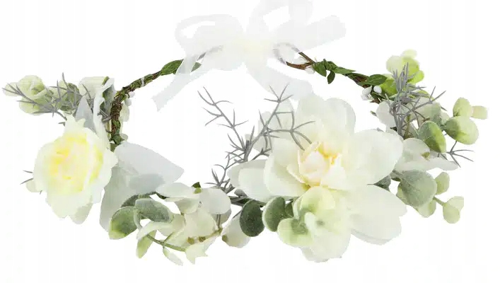Красивый, нежный венок с белыми цветами разного размера, украшенный веточками разных оттенков зеленого. Этот ободок, отличающийся пружинистым характером, также можно использовать в качестве венка для причастия.