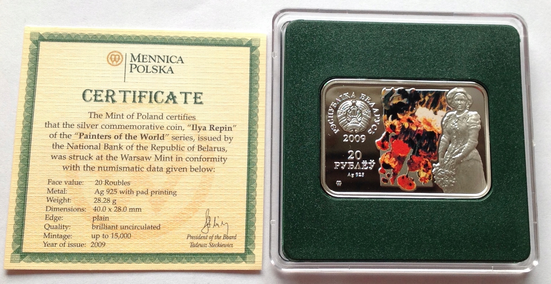 Білорусь 20 Рублів 2008 Repin Ag (28.28gr)