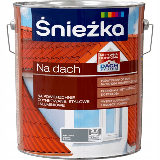 Снежка На Крышу – высококачественная поливинил-акриловая краска для новых и отремонтированных наружных металлических поверхностей: оцинкованных, стальных и алюминиевых. Это продукт, который создает быстросохнущие, эластичные и прочные покрытия с очень хорошей адгезией к основанию, хорошими механическими свойствами и высокой устойчивостью к коррозии, свету, воде и другим атмосферным факторам. Продукт является частью современной системы защиты металлических поверхностей Snieżka DACH SYSTEM. Используя системное решение, вы получаете гарантию совместимости продукции и качественный конечный результат.