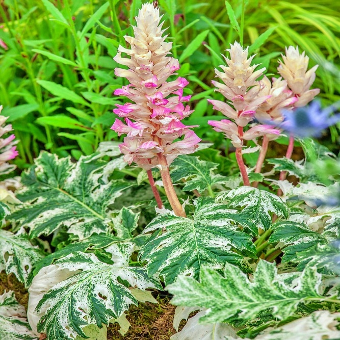 Акантус «Уайтуотер» — декоративное растение, привлекающее внимание своими привлекательными листьями. Листья светло-зеленые с отчетливыми белыми пятнами или полосами, что придает им уникальный внешний вид. Это растение образует розетки листьев, которые кажутся изящно рельефными. В период цветения образует длинные столбчатые соцветия розовых оттенков.