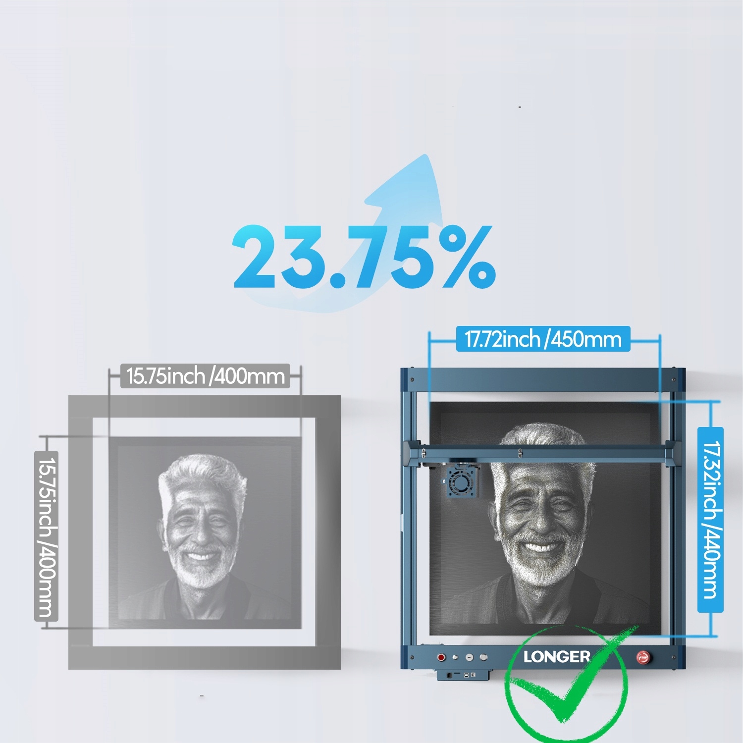 Лазер B1 может иметь рабочую область с размерами 450 х 440 мм, что на 23,75% по сравнению с конкуренцией. Это идеальное решение для панелей A3.