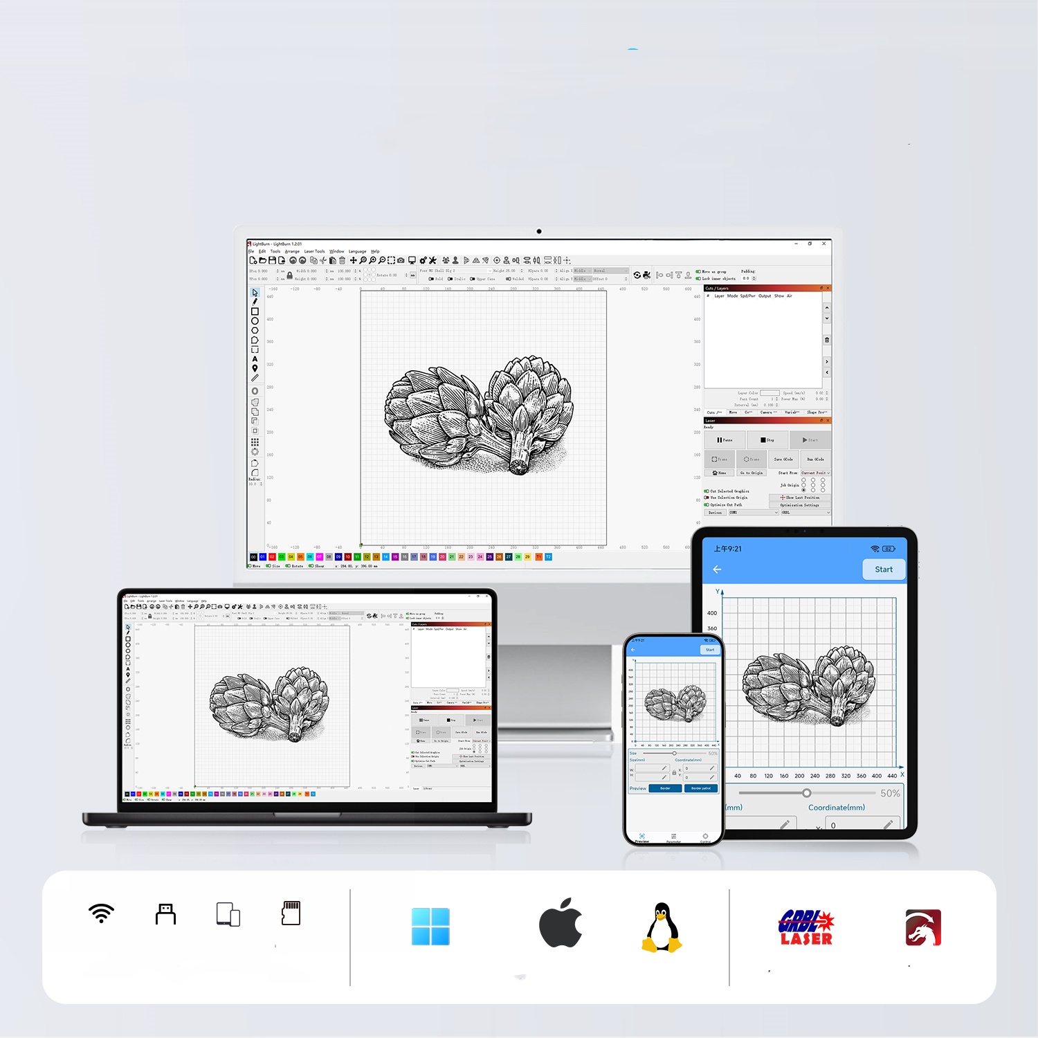 Программное обеспечение: lasergrbl для xp/7/8/10 (бесплатно), Lightburn для Windows, Mac OS и Linux
