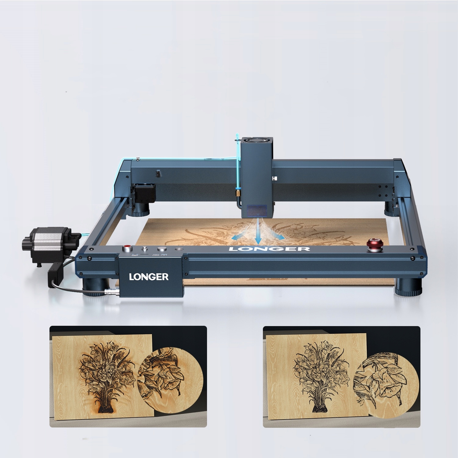 Насос с воздушным ассистом может быть автоматически включен и выключен и напрямую контролируется Lightburn, повышая точность и качество резки.