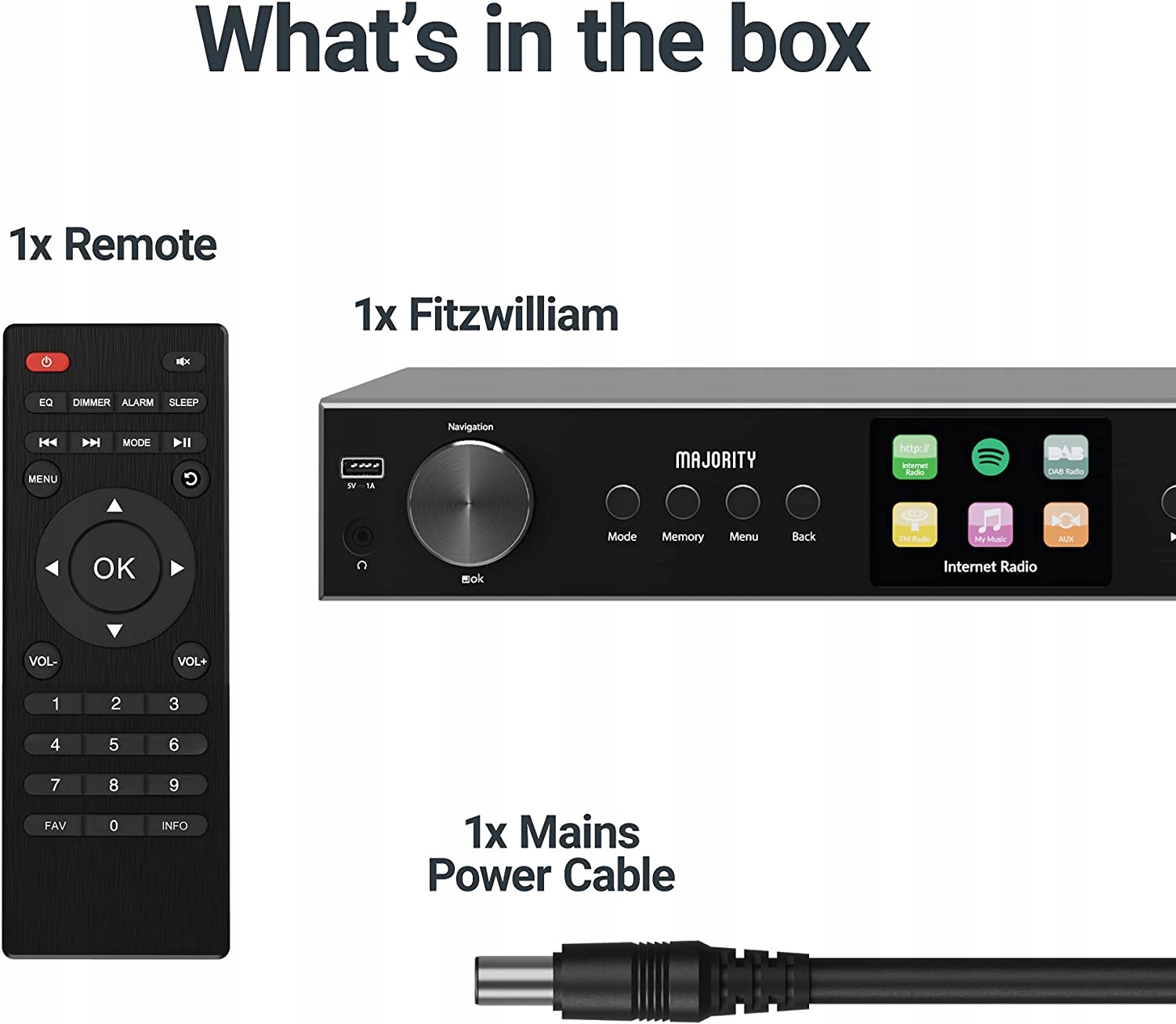 MAJORITY Majority Fitzwilliam 2 HiFi-тюнер, цифровой DAB / DAB + / FM и интернет-радио, Spotify Connect, Bluetooth, дистанционное управление, USB и AUX; оптическое, коаксиальное и обычное соединения, дисплей