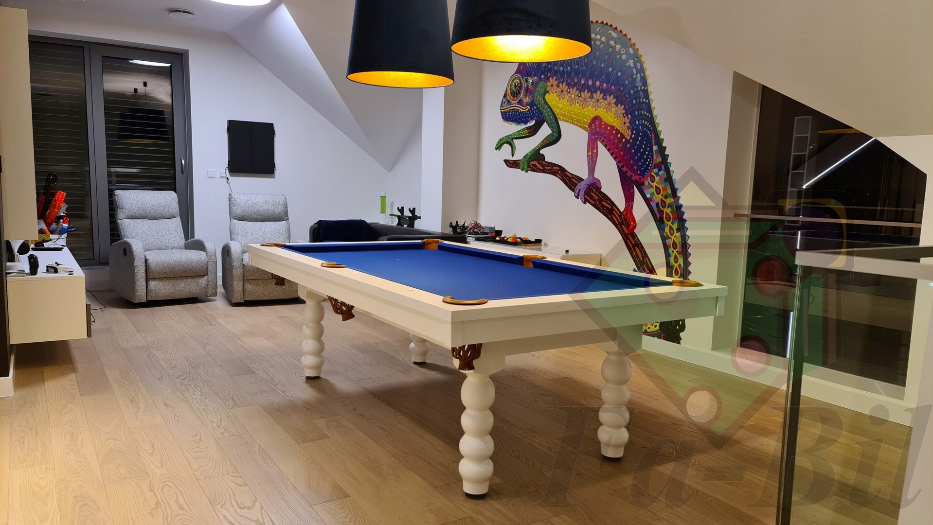 - столы и столы - сделаны по форме напоминающими бильярдный стол - отличное решение для обустройства. зал в едином стиле для бильярда
